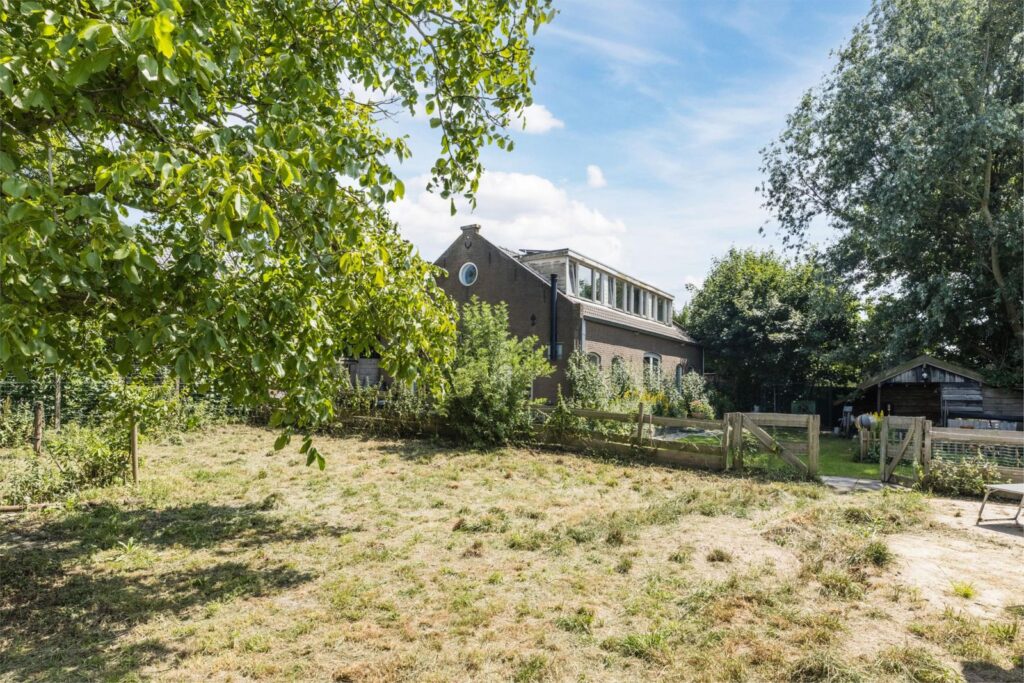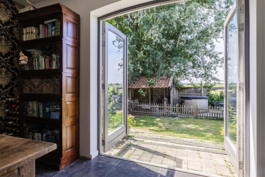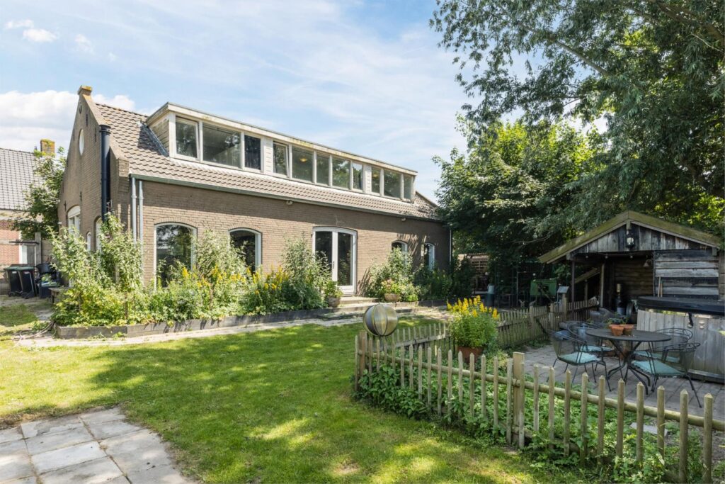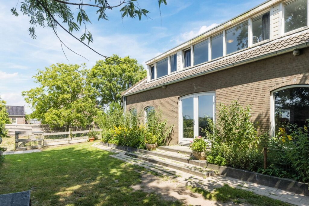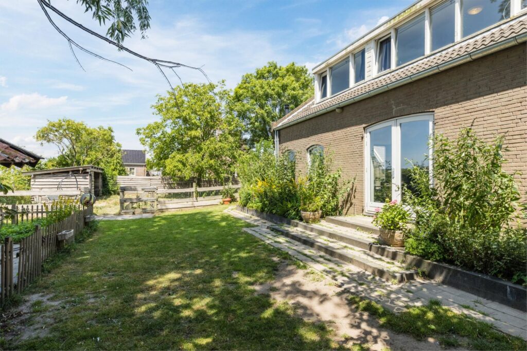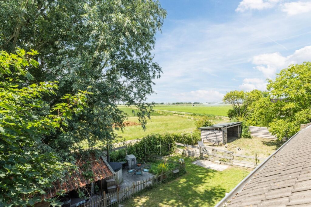 De woning heeft een grote en lichte woonkamer waar de vele ramen met charmante boogvormen zorgen voor een uitnodigende sfeer en vrij uitzicht op de polder en de royale zonnige tuin. De tuin heeft diverse terrassen en een vrijstaande schuur met sfeervolle overkapping en ligt op een perceel van maar liefst 893 m² aan een rustige dijk net buiten het dorp. Een heerlijke plek voor wie graag privacy heeft en buiten leeft, thuis wil werken of de ruimte zoekt voor hobby’s of dieren of gewoon ontspannen.