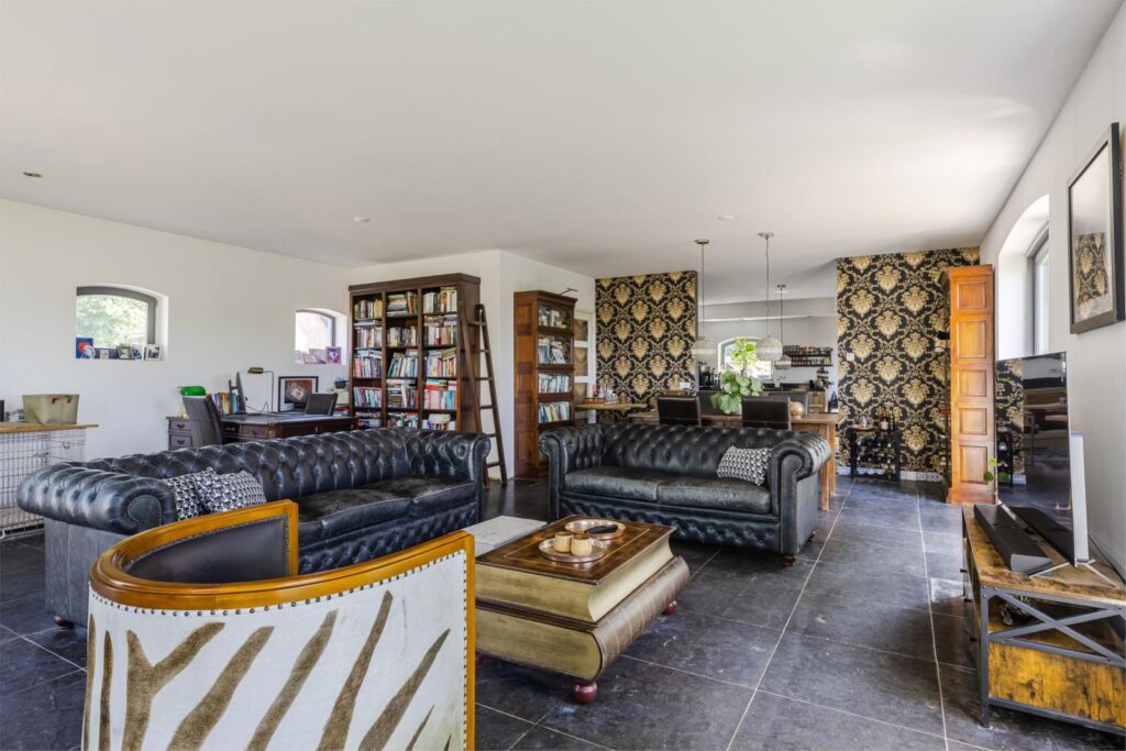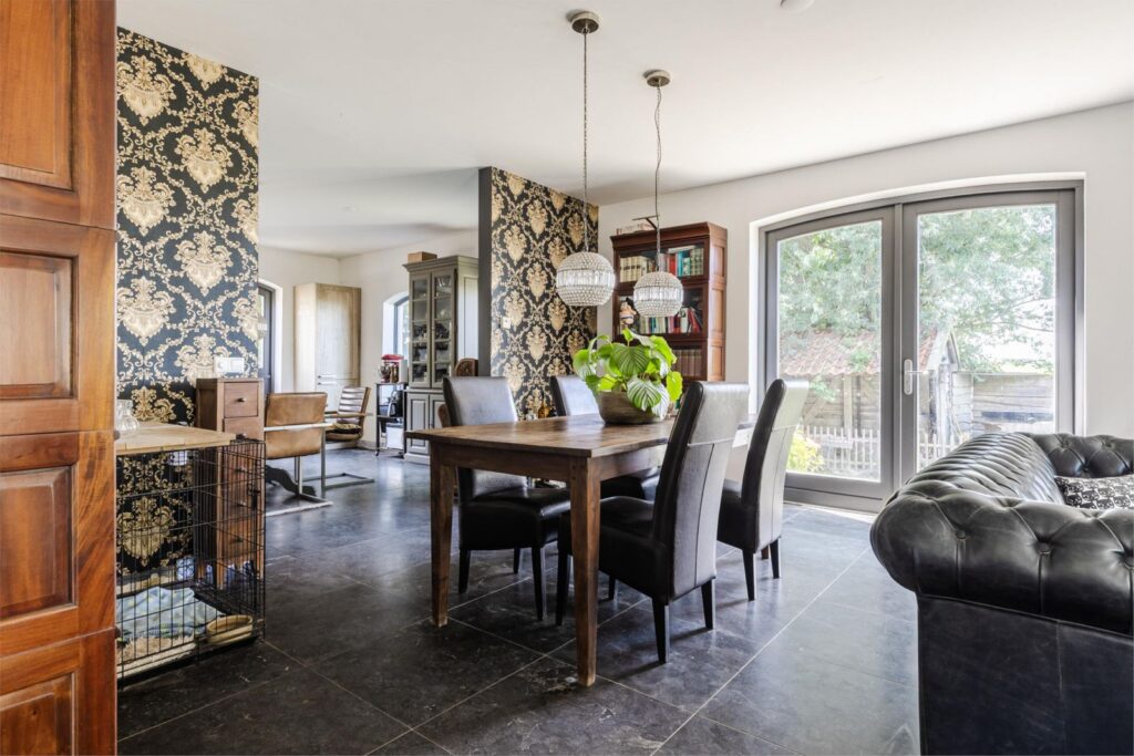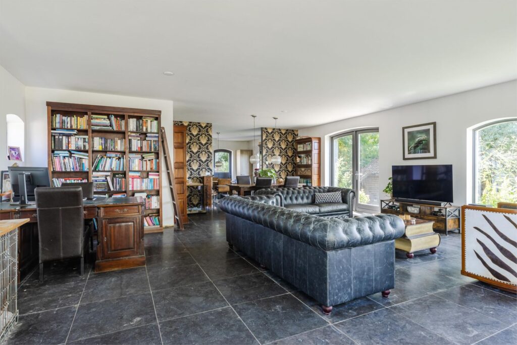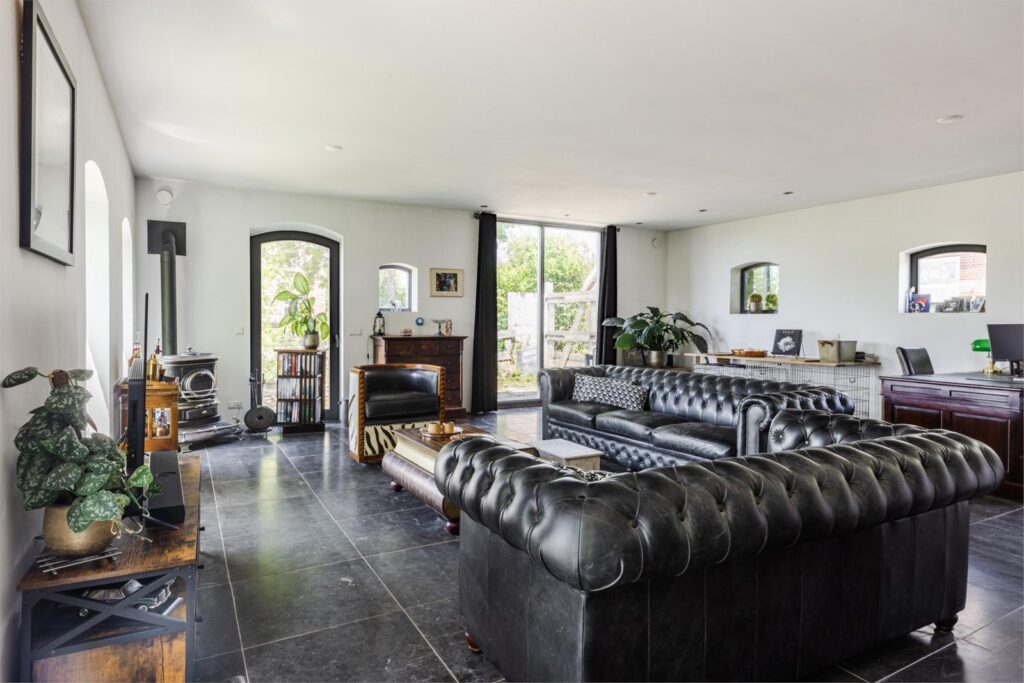 •Lichte grote woonkamer met Belgisch hardstenen vloer met vloerverwarming, houtkachel (Friesche Grandeur) en dubbele deuren naar het terras met uitzicht op de tuin en polderlandschap door de karakteristieke boogramen.