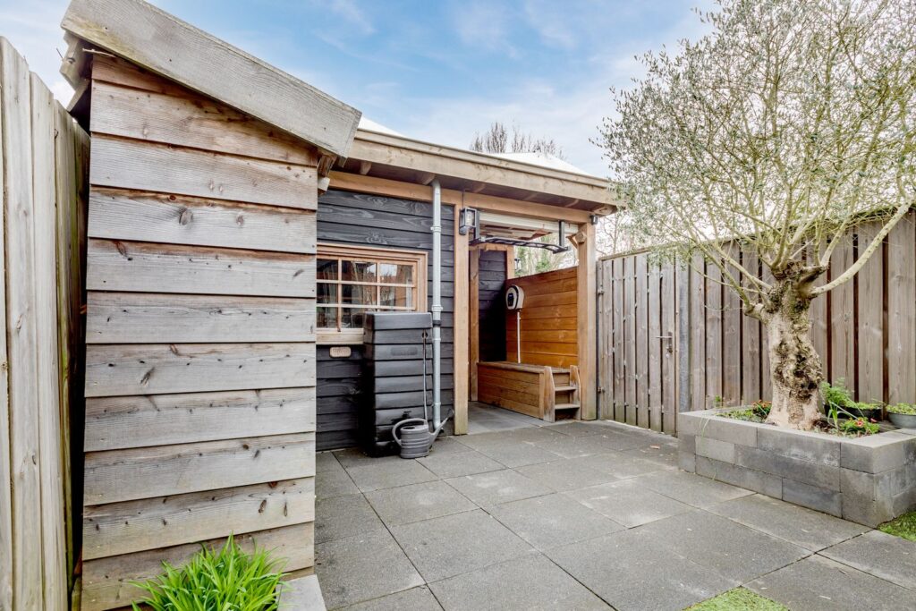 De tuin op het zuiden biedt volop privacy en is voorzien van een luxe buitenkeuken en een vrijstaande schuur met veranda.