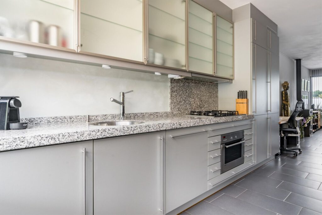 De moderne keuken is praktisch ingericht met een wandopstelling en biedt tal van onder- en bovenkasten voor optimale opbergruimte. Het ruime granieten werkblad is ideaal voor het plaatsen van keukenmachines en bereiden van maaltijden.