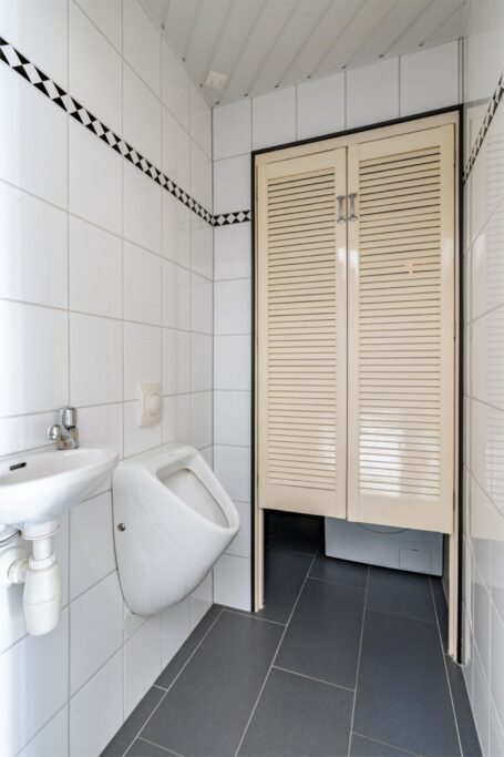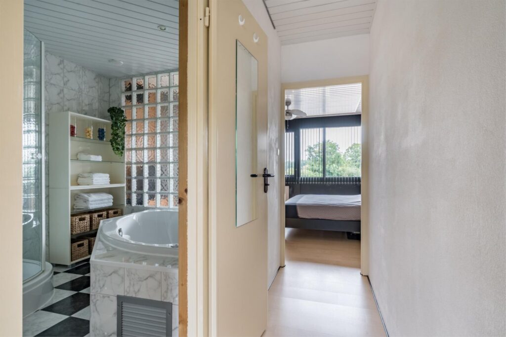 De wanden zijn volledig betegeld in een moderne kleurstelling, het plafond is verlaagd en voorzien van dimbare inbouwspots en speakers. De betegelde vloer heeft ingebouwde vloerverwarming.