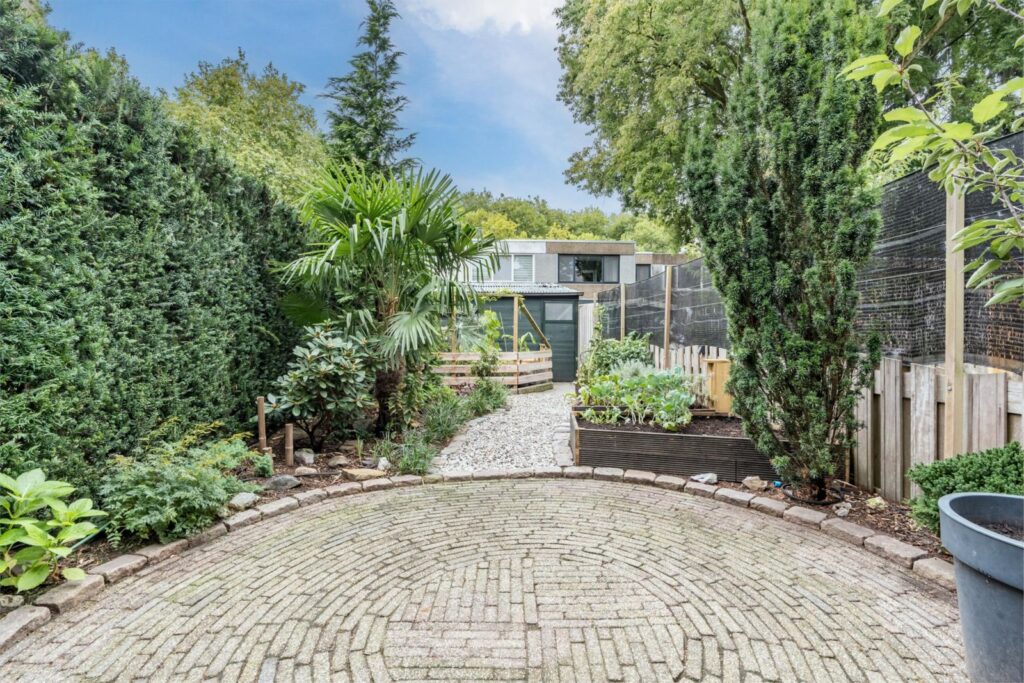 - Privacy biedende tuin met fraaie berging en overkapping;