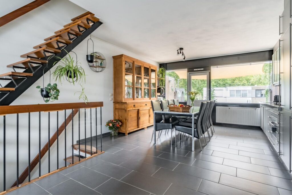 Op de eerste verdieping is de royale woon- eetkamer met luxe open keuken. De vloer is volledig betegeld en de gestucte lichte wanden en plafond geven een extra ruime uitstraling. De woonkamer heeft aan de voor- en achterzijde op maat gemaakte lamellen, is zeer ruim van afmetingen en geniet veel daglichtinval door de grote ramen aan de voor- en achterkant. Aan de achterzijde van de woning komt u door de deur met rolhor op het fraaie balkon met uitzicht op de tuin. Onder het aanwezige zonnedoek kunt u hier heerlijk vertoeven. Daarnaast vindt u in de woonkamer een sfeervolle moderne houtkachel, die tijdens winterperiode extra warmte en gezelligheid biedt.
