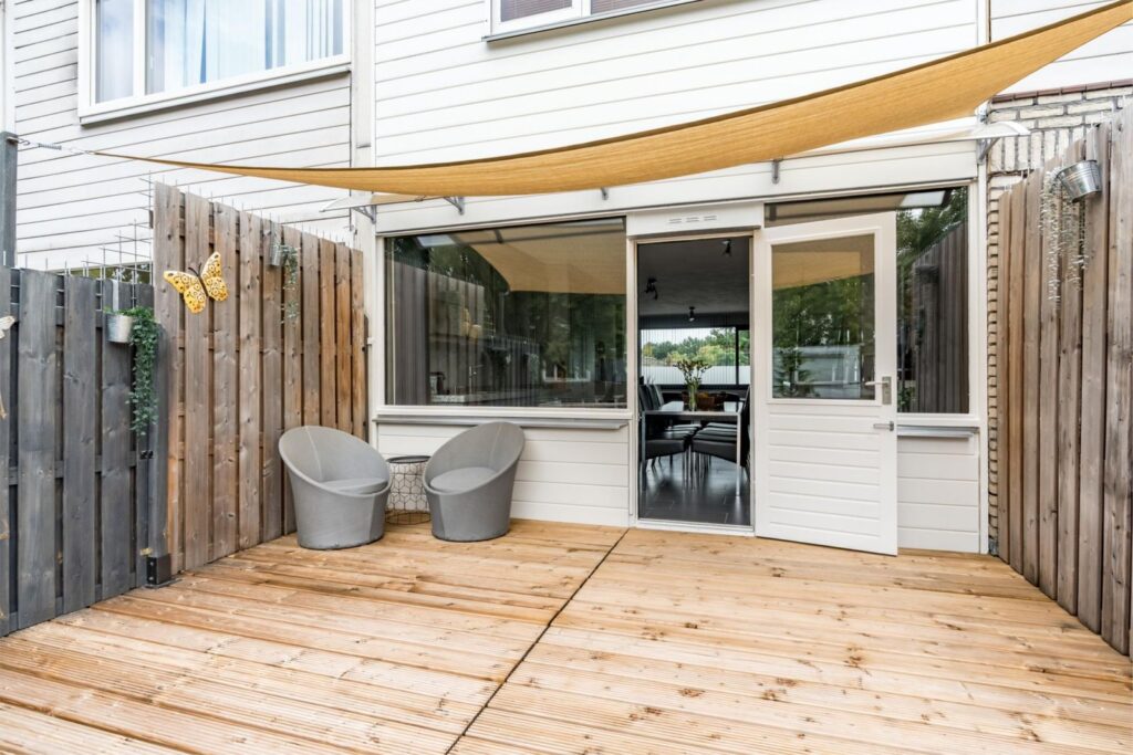 In de achtertuin bevindt zich onder het balkon/overkapping een gezellige zitruimte met elektrapunten en ingebouwde plafondverlichting.