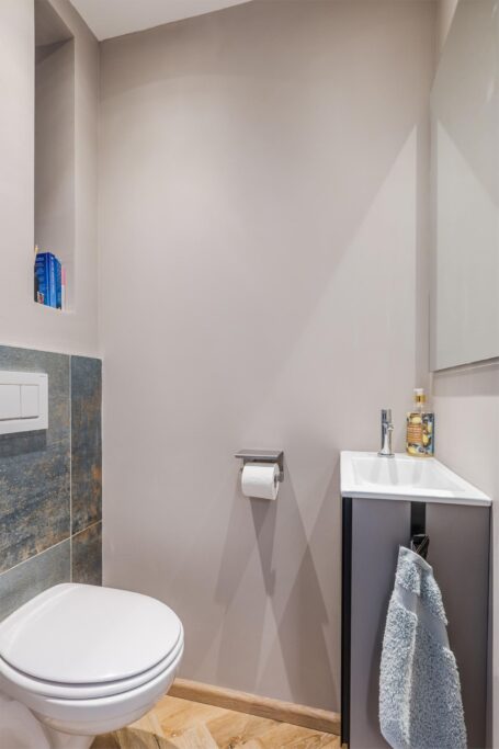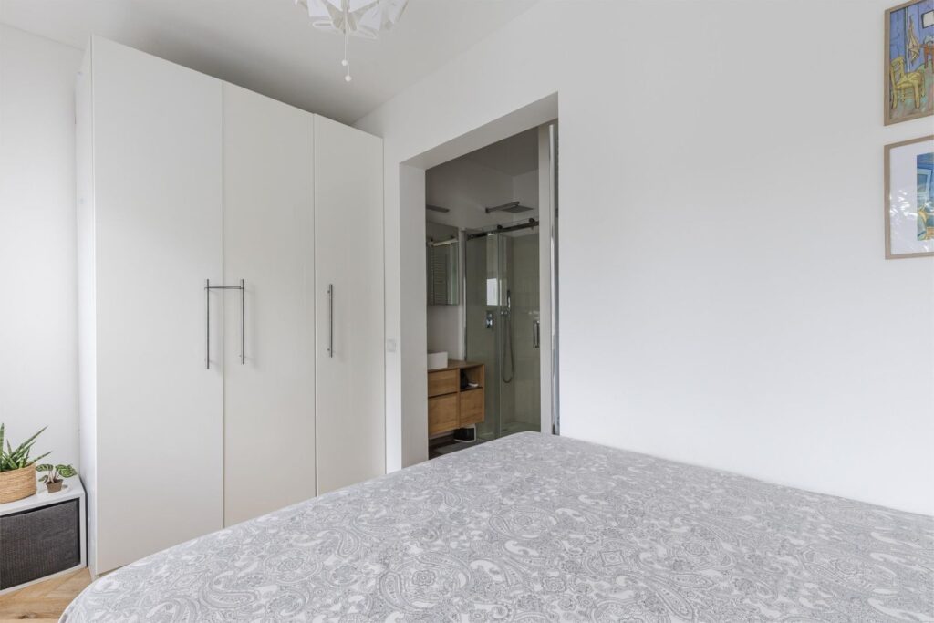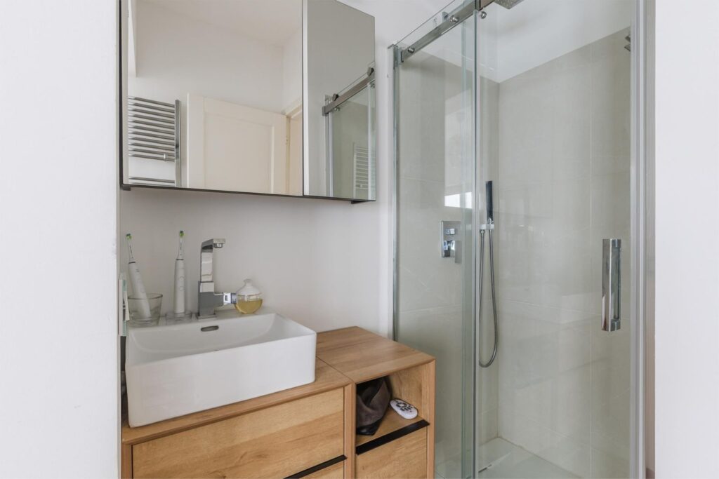 - the bedroom, located at the quiet rear. The bedroom offers space for a double bed and a wardrobe. It features a modern en-suite shower with heated towel rail. The sink next to it is very practical in every-day living.
