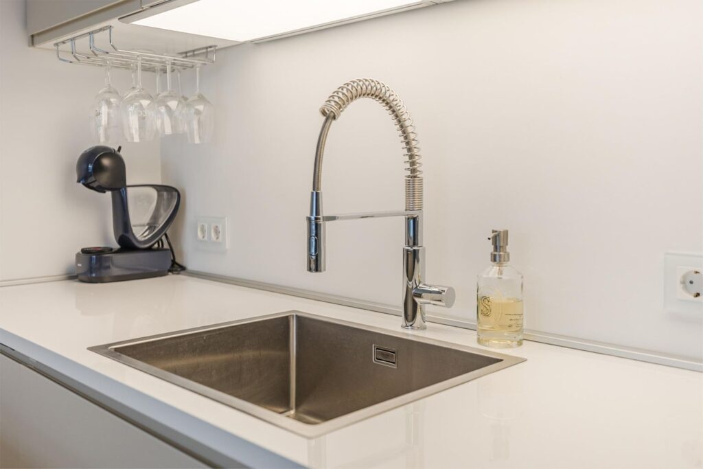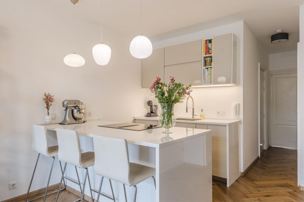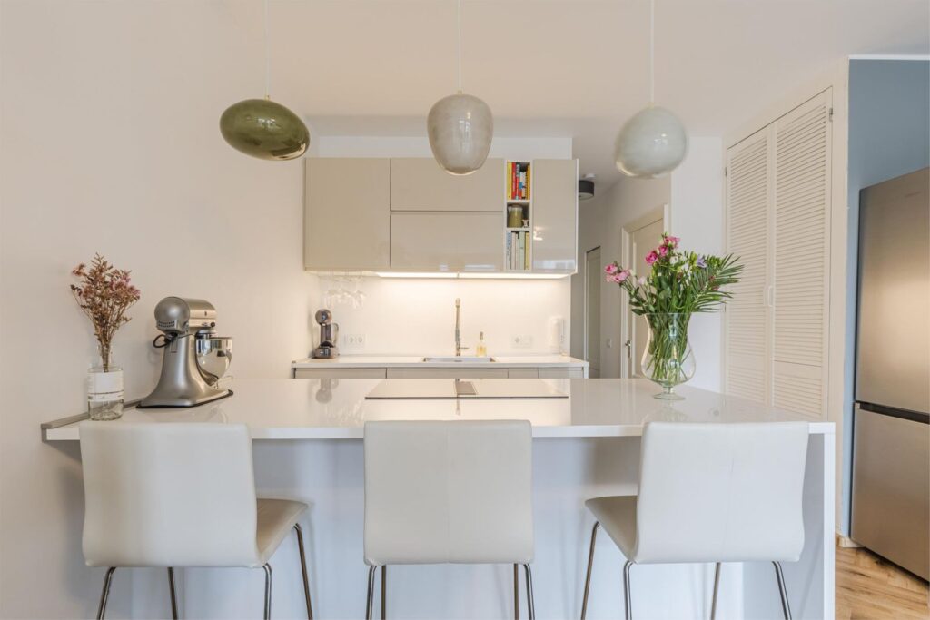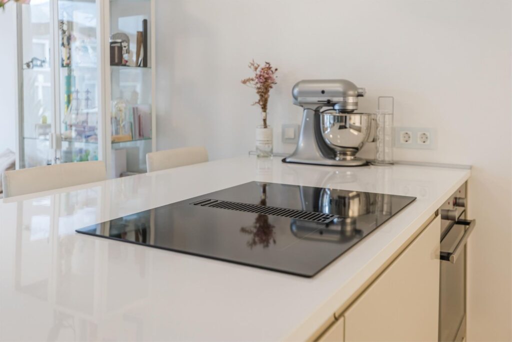 De open keuken is het hart van het huis: een stijlvol kookeiland (met o.a. AEG inbouwoven en 4-pits inductiekookplaat met geïntegreerde afzuiging) fungeert ook als bar. Er is zitruimte voor drie personen, ideaal om vrienden te ontvangen. Aan de andere zijde vind je de spoelbak met hoge uittrekbare kraan en de ingebouwde vaatwasser – een zeer functionele werkruimte. Tegenover de keuken is plaats voor een grote koelkast.