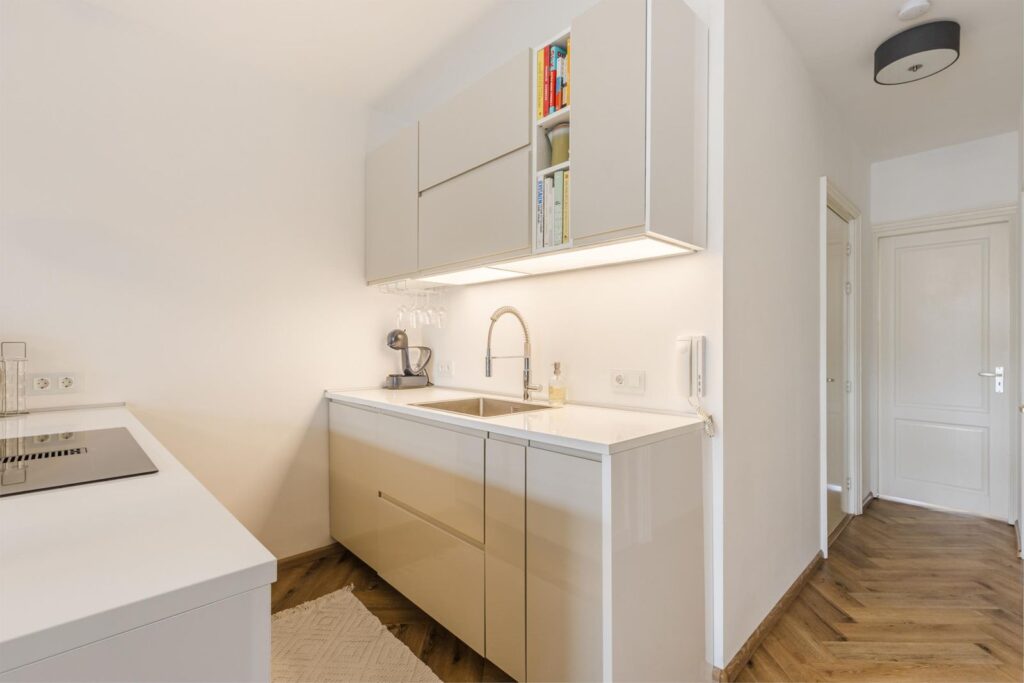 LAYOUT: Entering via the shared staircase of the friendly VvE, you step into a bright, practical, and well-designed apartment of 43 m². From the small entrance hall in the apartment, you access the warm and inviting living room, with large windows that allow natural light to flow in. The open kitchen is the true heart of your new house: a stylish island (including AEG built-in oven and 4 zones induction hob with integrated extractor hood) doubles as a dining bar. there is seating space for three, but it also great to host and entertain when friends are over. On the opposite side, you’ll find the sink and tall, pull-out spray faucet as well as the built-in dishwasher, making this a functional area. Next to the storage wardrobe opposite the kitchen, there is space for a large fridge.