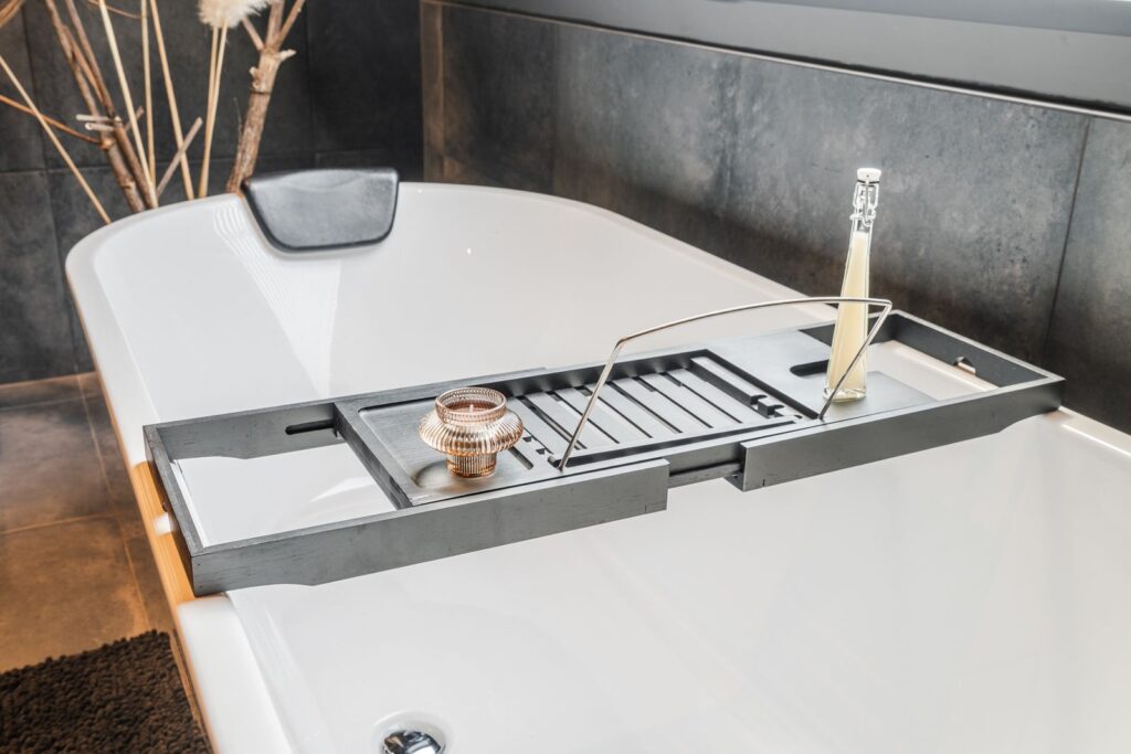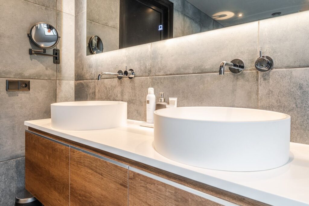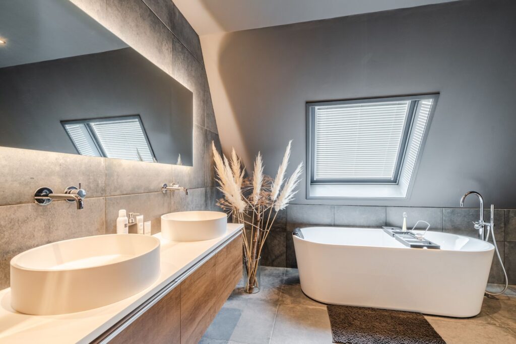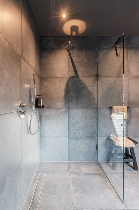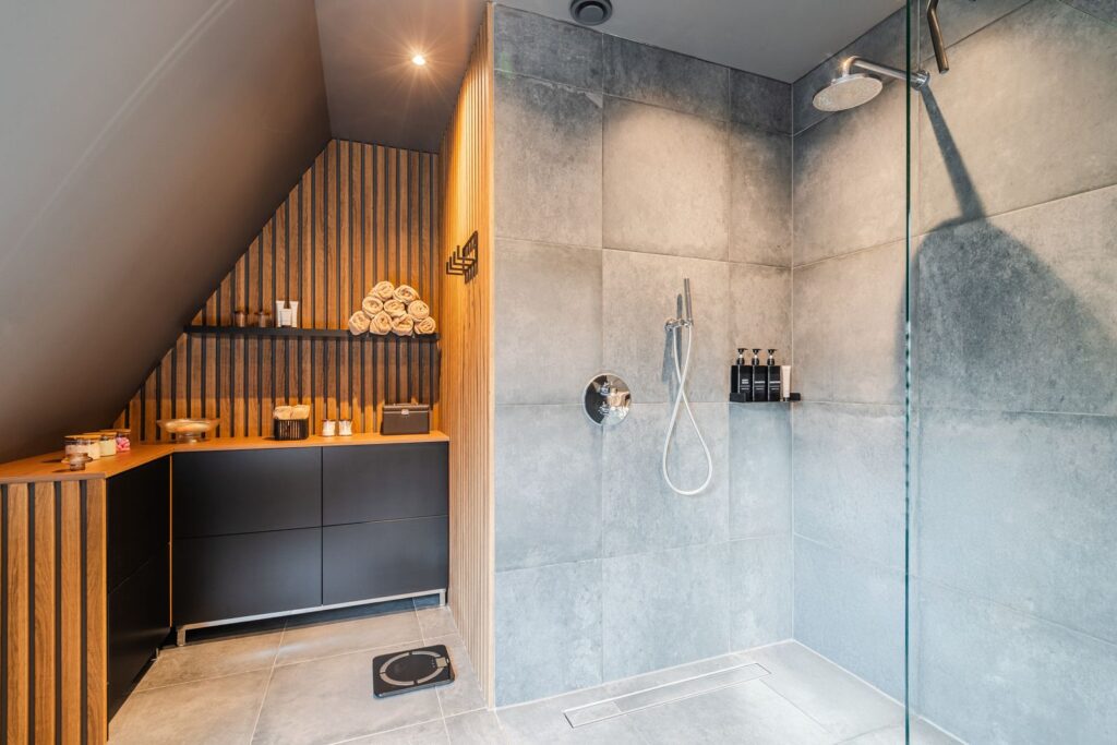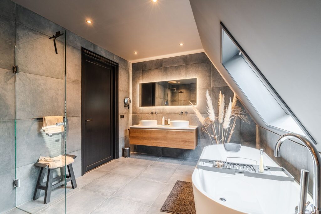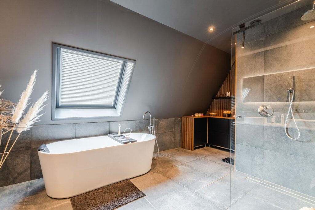 The first floor also includes a separate toilet and a large luxury bathroom (14m2), featuring underfloor heating, a freestanding bathtub, double-sink vanity, and a walk-in shower with rain shower head and hand shower. The skylight provides plenty of natural light while ensuring your privacy. A very spa-like experience.