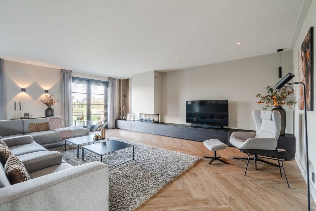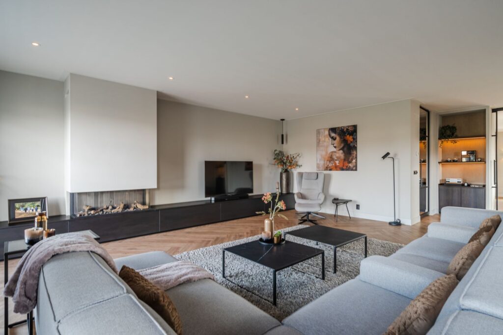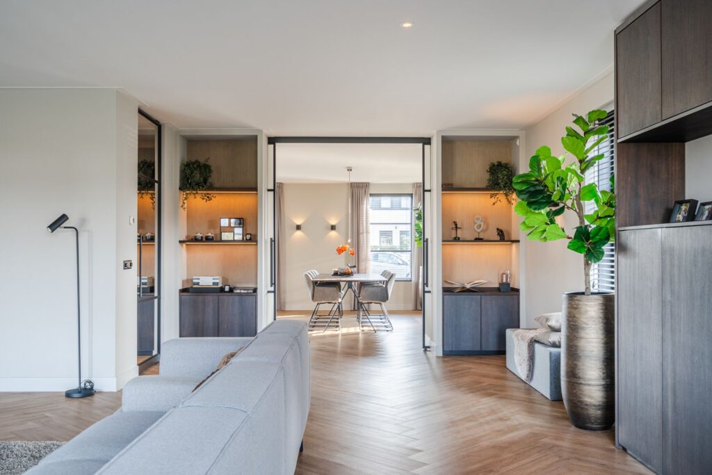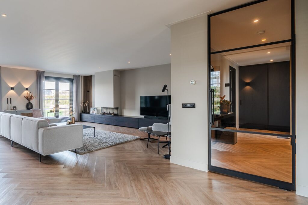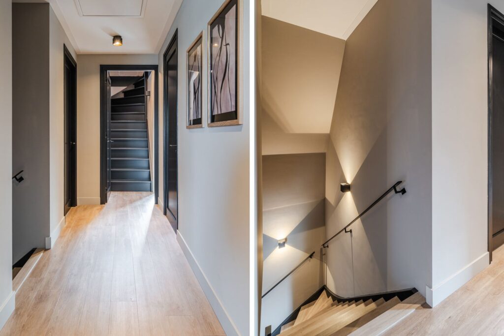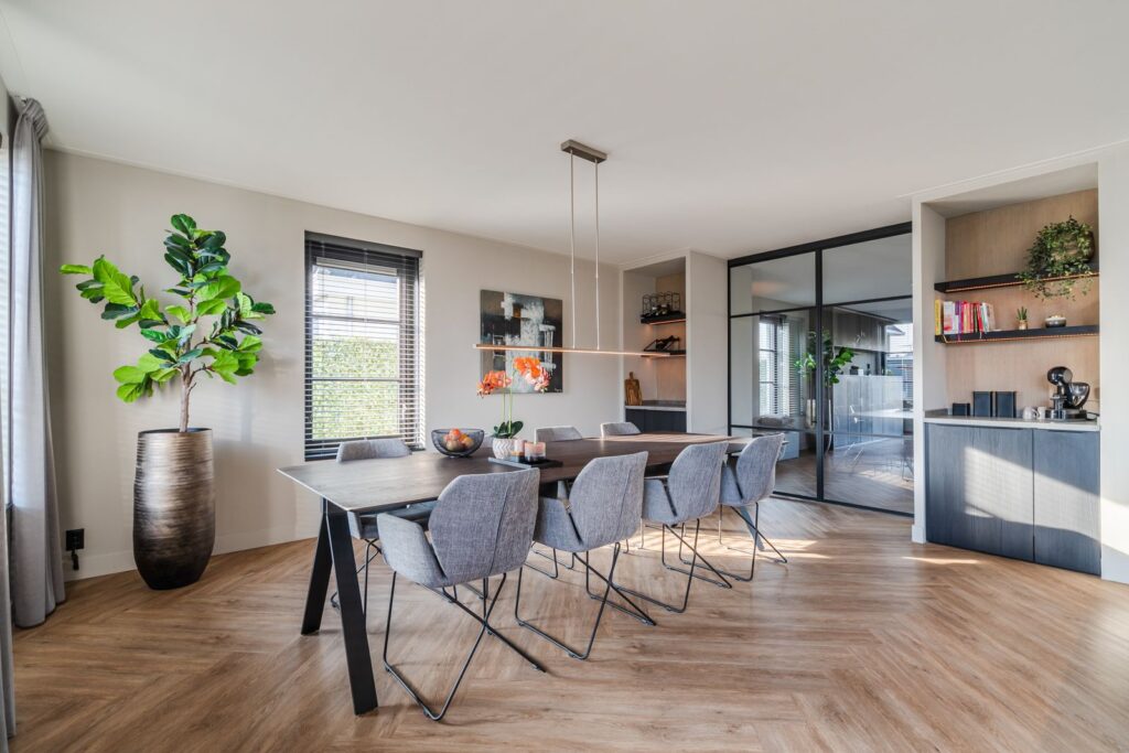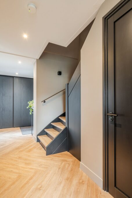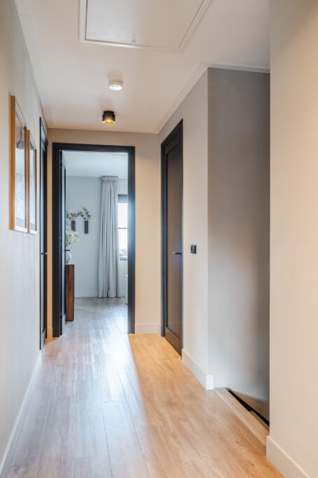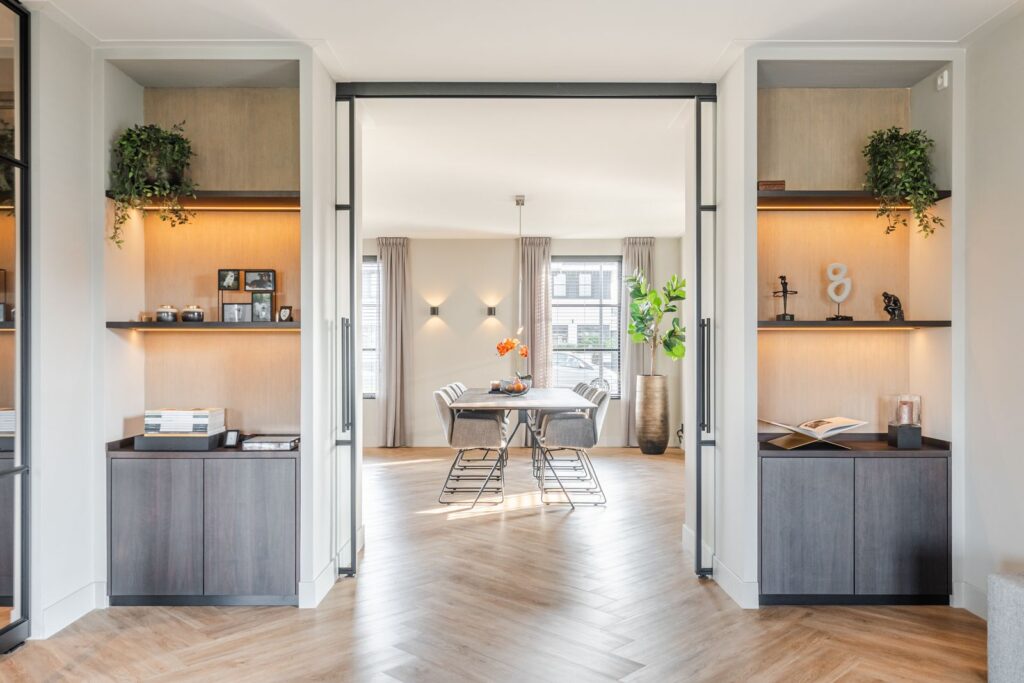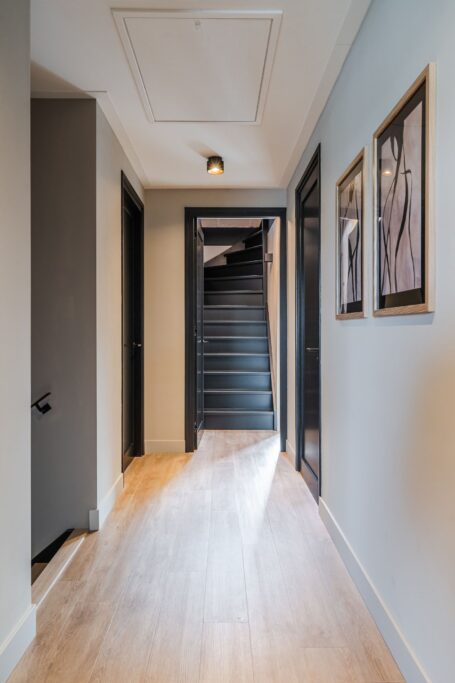 Located at the rear of the house, with double doors opening to the terrace and backyard, this modern, sleek, yet soft interior—boasting custom-made furniture and an integrated gas fireplace—creates an inviting atmosphere. The ground floor has light PVC herringbone flooring throughout, with underfloor heating. The en-suite with steel sliding doors flows seamlessly into the spacious dining area (37 m2) at the front of the house. Here you’ll find a beautiful, fully equipped kitchen, with all modern conveniences like a boiling-water tap, an induction cooktop with integrated vent, a fridge and freezer, a double oven with integrated microwave, a dishwasher, and a bean-to-cup coffee machine—all neatly built in, of course. What more could you want? The large kitchen island (1.20 m x 3.05 m) features a high-end waterfall countertop made from Dekton. The two alcoves house a coffee corner for your cozy morning ritual, but this kitchen space is also perfect for entertaining guests and game nights.