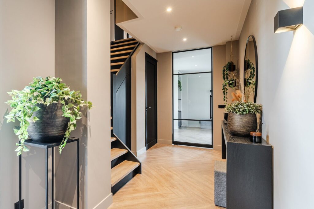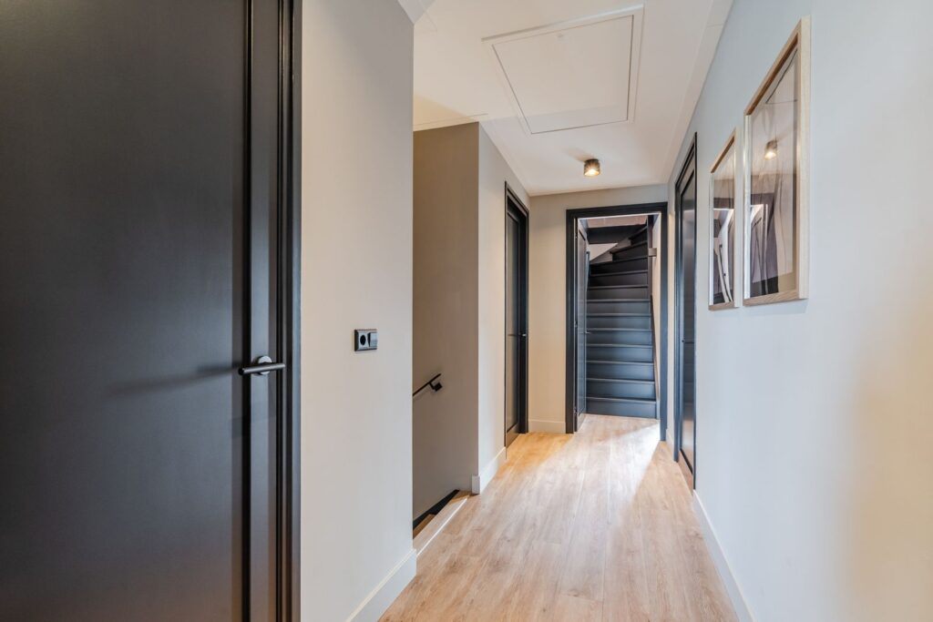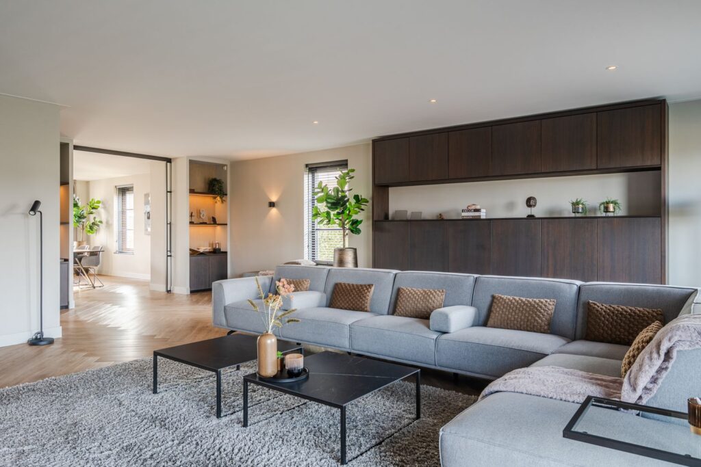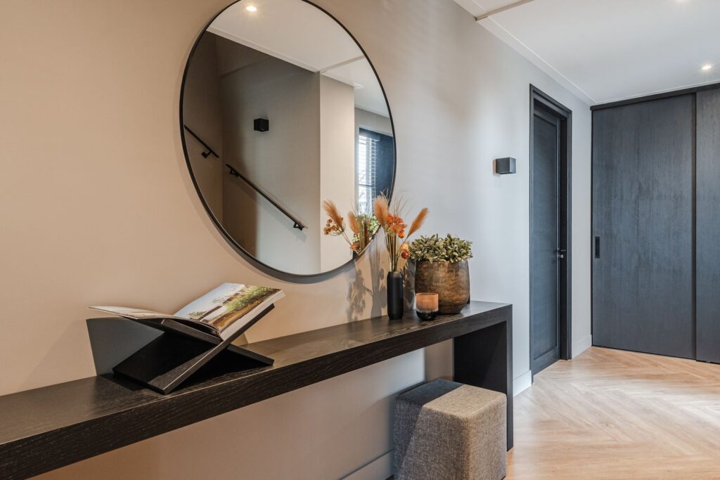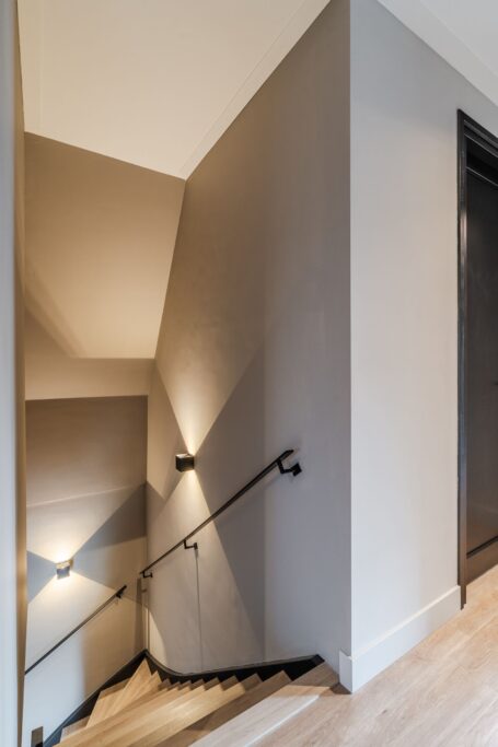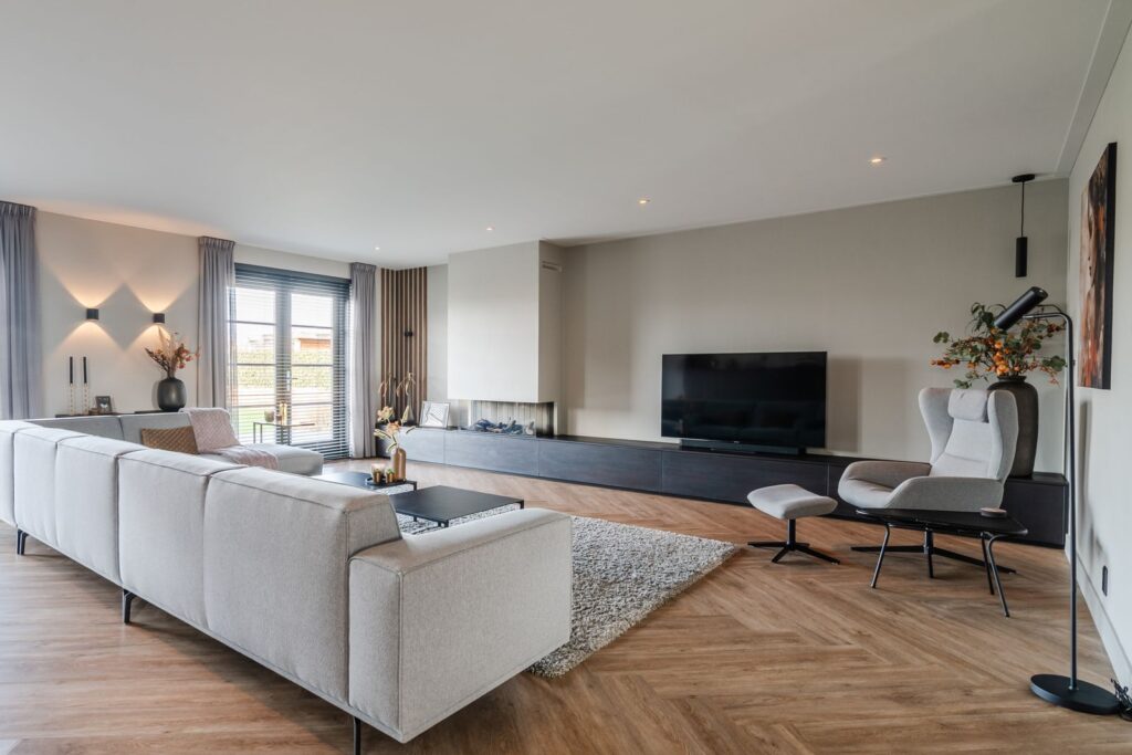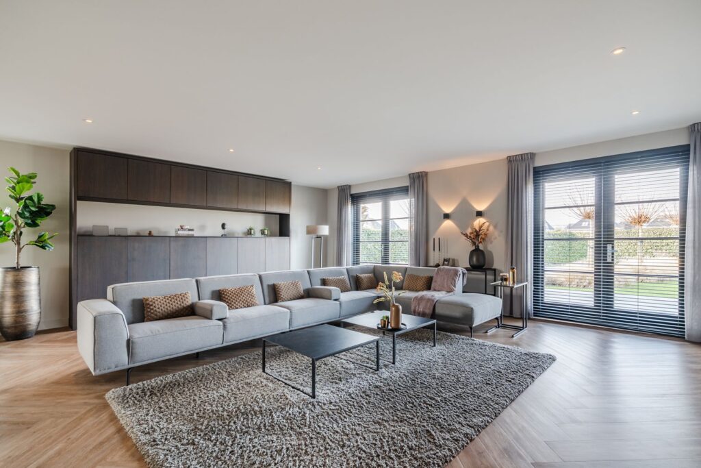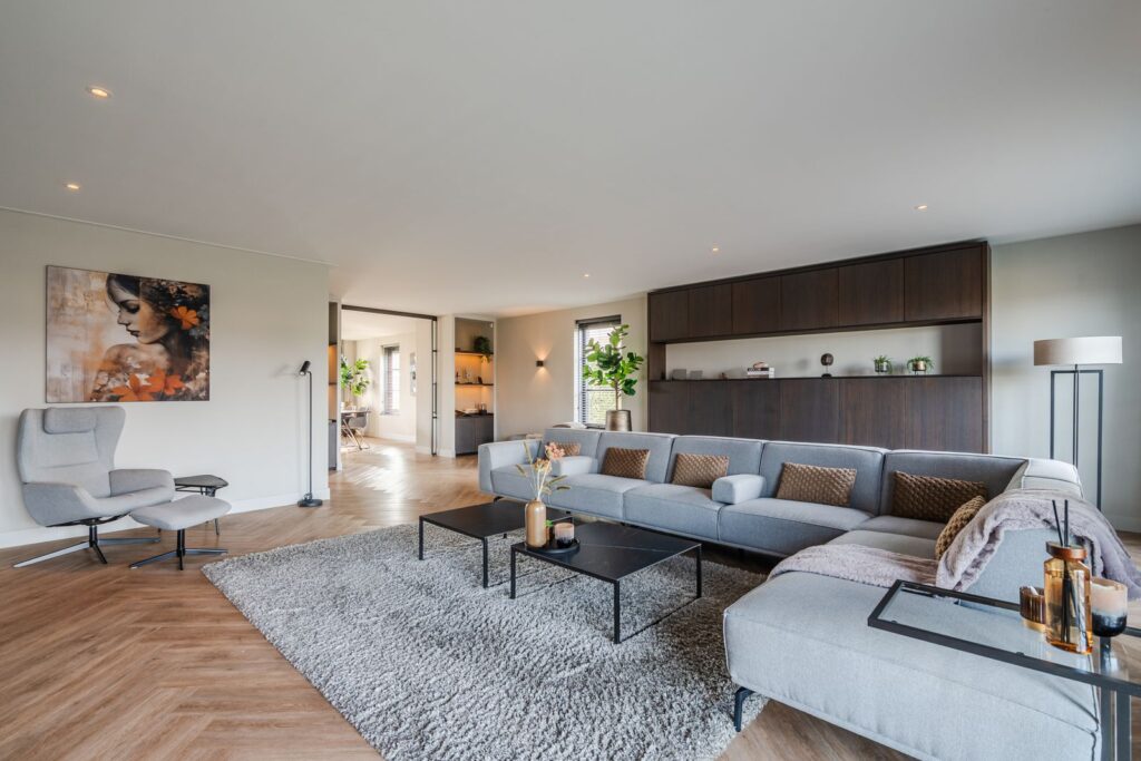 Located at the rear of the house, with double doors opening to the terrace and backyard, this modern, sleek, yet soft interior—boasting custom-made furniture and an integrated gas fireplace—creates an inviting atmosphere. The ground floor has light PVC herringbone flooring throughout, with underfloor heating. The en-suite with steel sliding doors flows seamlessly into the spacious dining area (37 m2) at the front of the house. Here you’ll find a beautiful, fully equipped kitchen, with all modern conveniences like a boiling-water tap, an induction cooktop with integrated vent, a fridge and freezer, a double oven with integrated microwave, a dishwasher, and a bean-to-cup coffee machine—all neatly built in, of course. What more could you want? The large kitchen island (1.20 m x 3.05 m) features a high-end waterfall countertop made from Dekton. The two alcoves house a coffee corner for your cozy morning ritual, but this kitchen space is also perfect for entertaining guests and game nights.