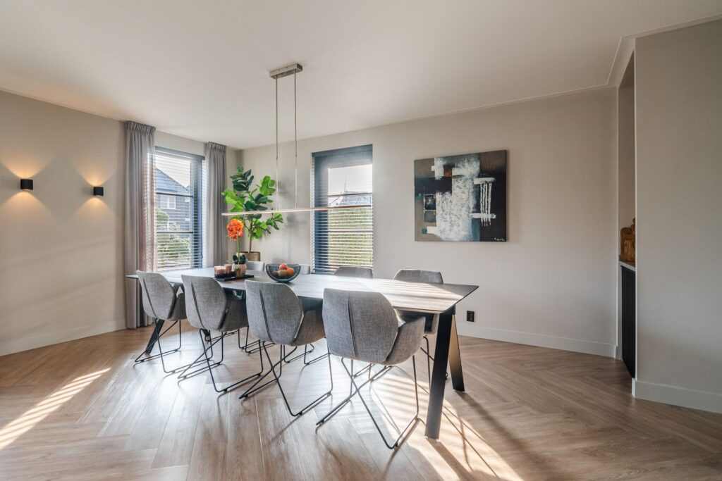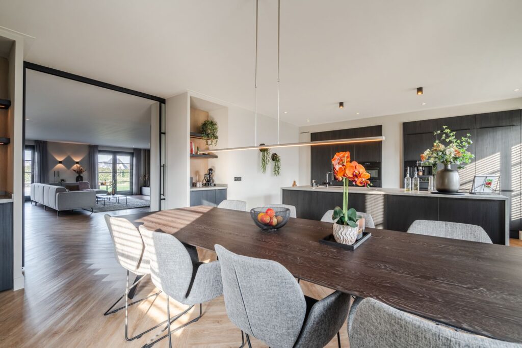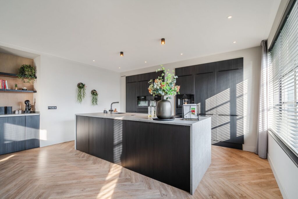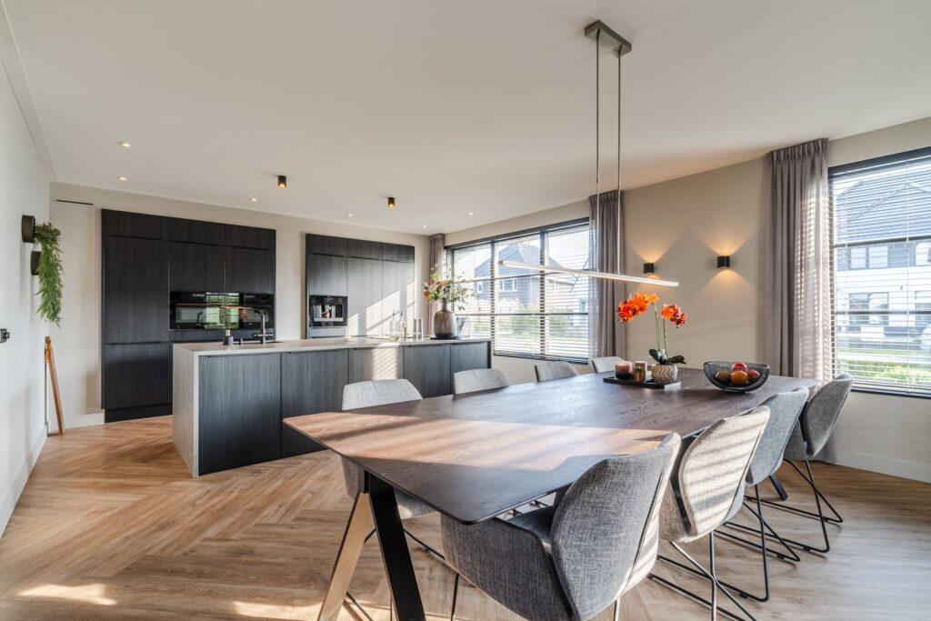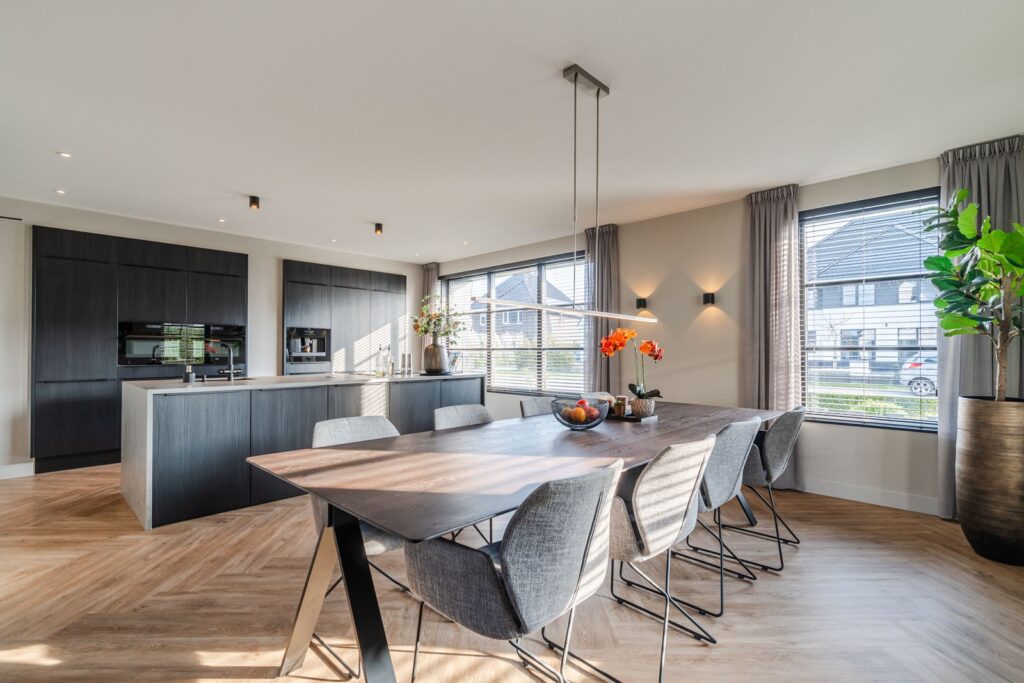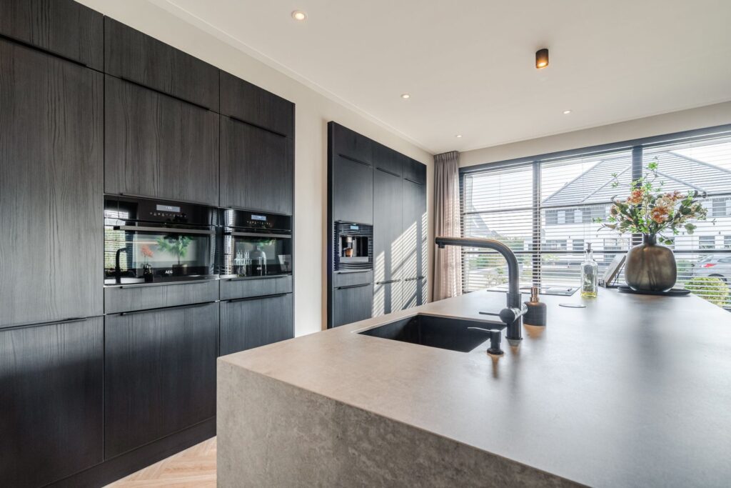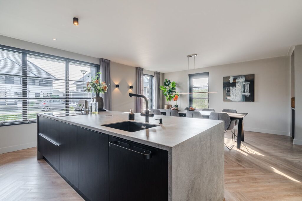 De woonkamer is gesitueerd aan de achterzijde van de woning, met dubbele openslaande deuren naar de tuin met aangrenzend groot terras. De moderne, strakke, maar toch warme inrichting met maatwerkmeubels en geïntegreerde gashaard creëert een uitnodigende sfeer. De gehele begane grond is voorzien van vloerverwarming en lichte jumbo-pvc-visgraatvloer. Via de en suite met stalen schuifdeuren kom je in de ruime woonkeuken (37 m2) aan de voorzijde van de woning. Deze prachtige, volledig uitgeruste keuken is van alle gemakken voorzien: een kokendwaterkraan, inductiekookplaat met geïntegreerde afzuiging, koelkast en vriezer, dubbele oven met magnetronfunctie, vaatwasser en een koffiemachine met bonen, alles natuurlijk netjes ingebouwd. Wat wil je nog meer? Het grote kookeiland (1,20 m x 3,05 m) heeft een luxe blad rondom van Dekton. Verder bevinden zich in de keuken nog twee nissen, met een uitnodigende koffiecorner om je ochtend rustig te beginnen. Het is een heerlijke ruimte voor sfeervolle diners en spelletjesavonden.