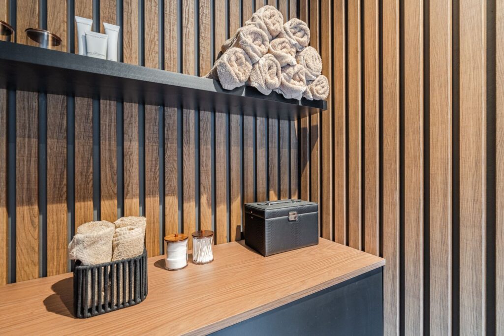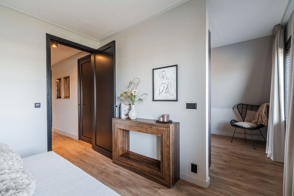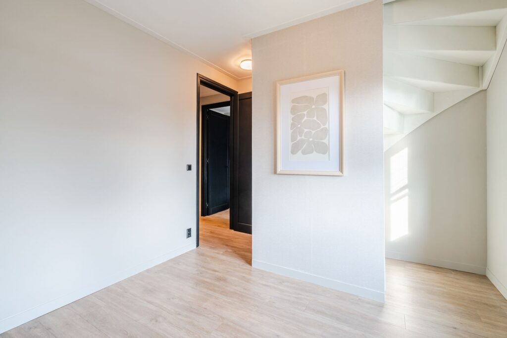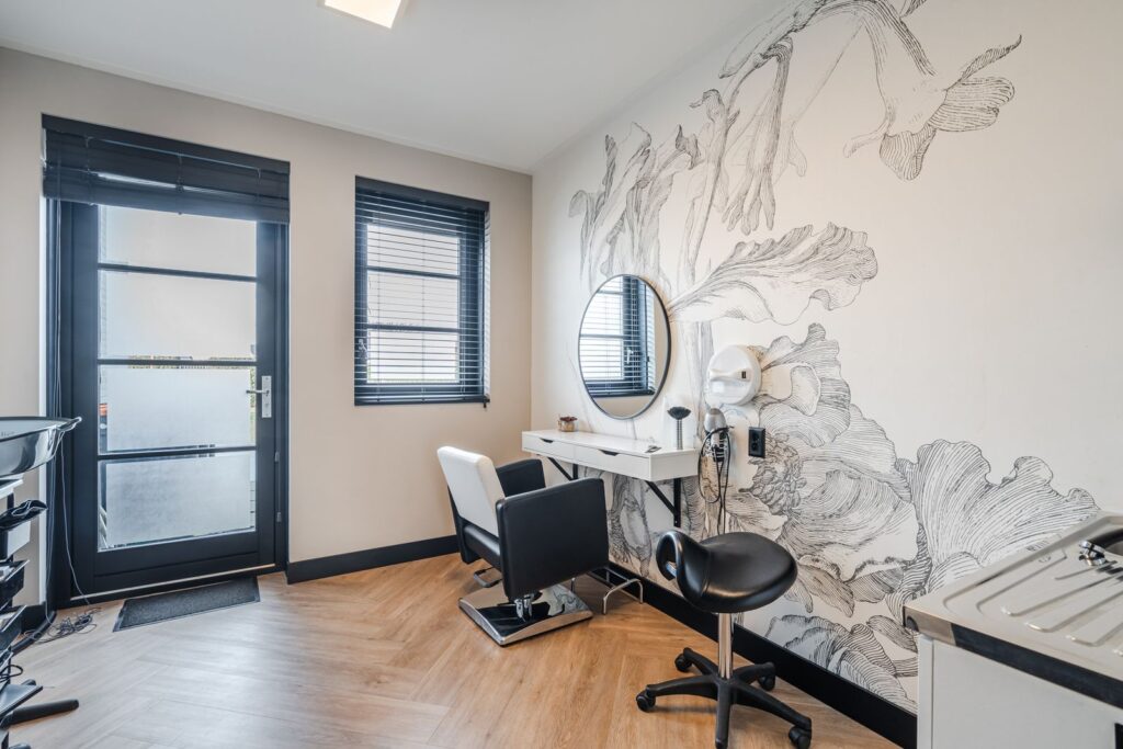 Back to where we started, the entrance hall includes a toilet and a wardrobe with sliding doors—a great storage solution for all your coats and shoes. You’ll also find the storage room here (9m2), which is currently set up as a hair salon and comes with hot and cold water supply. This multifunctional space could easily be repurposed as a utility room, office, or extra bedroom.