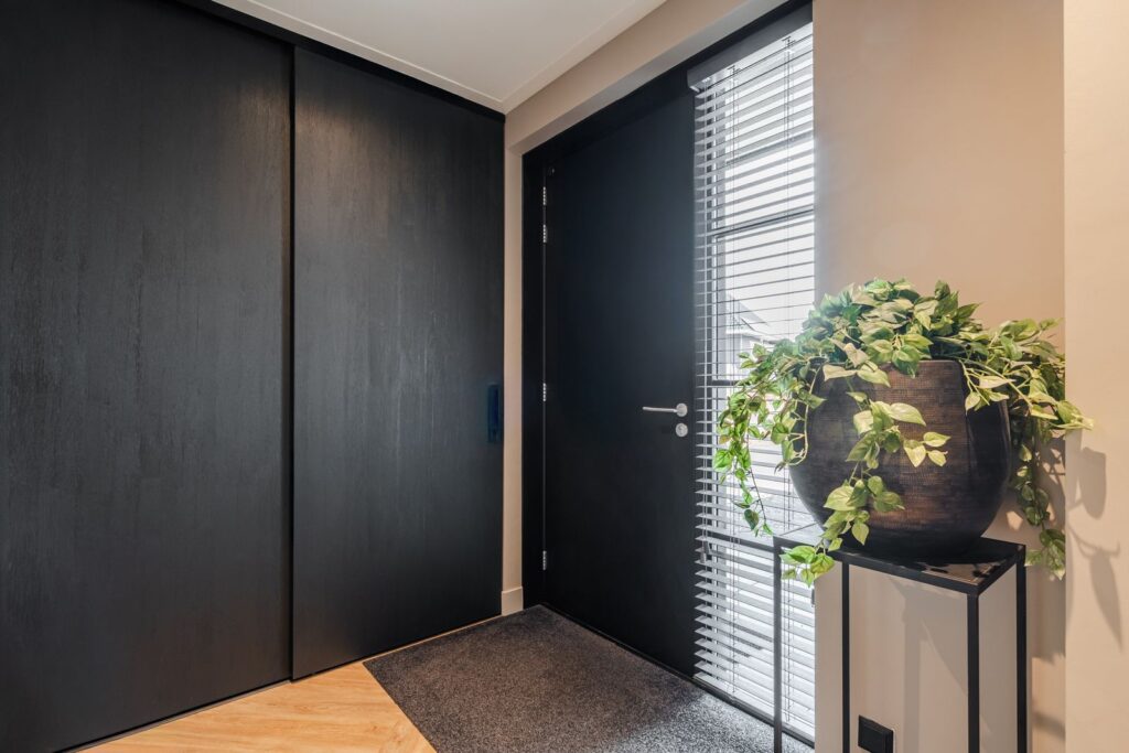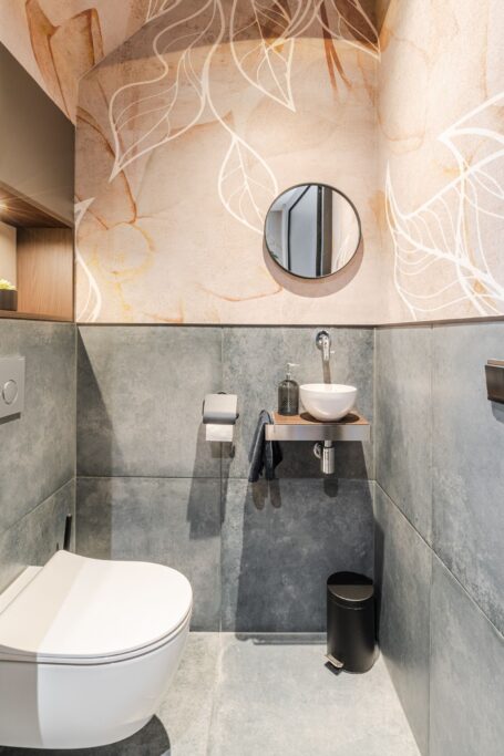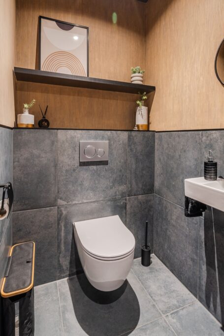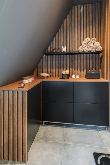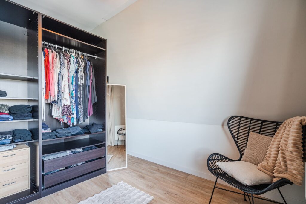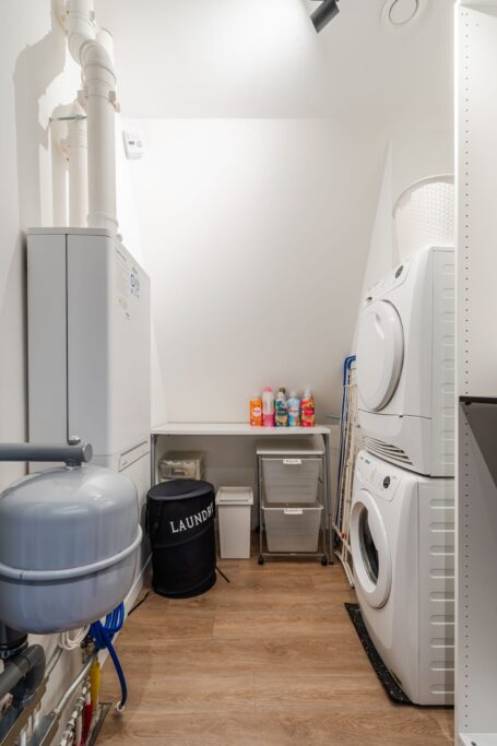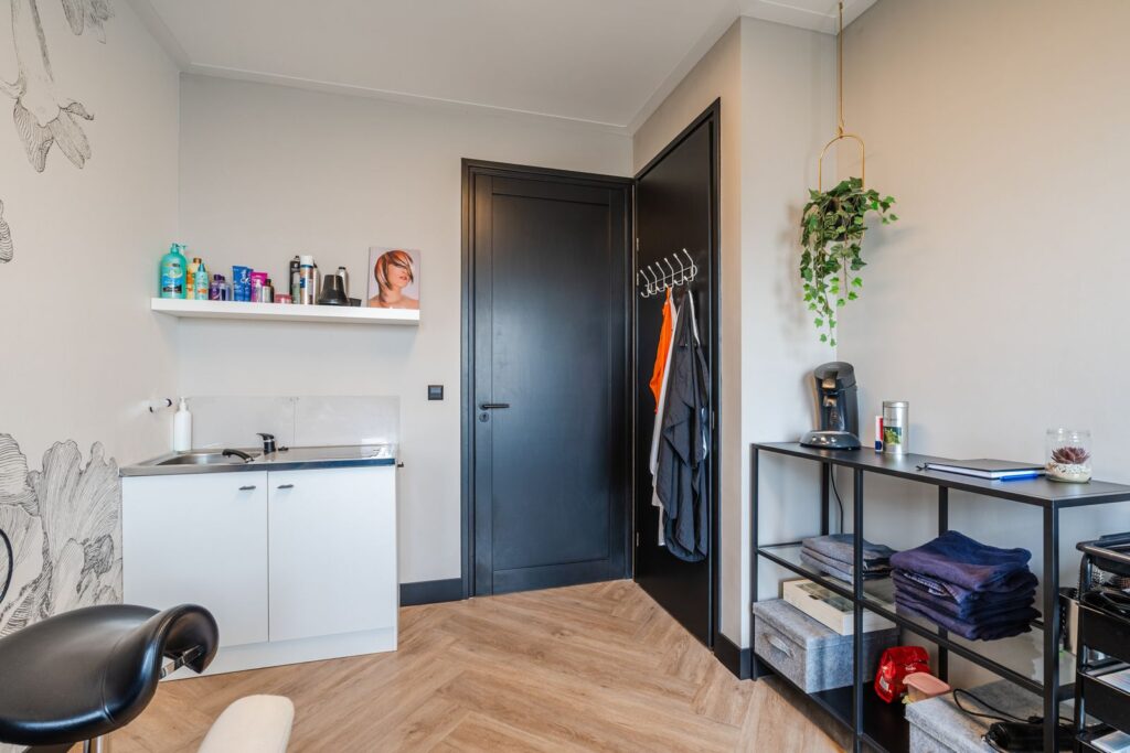 Terug in de entreehal vinden we ook het toilet en een garderobekast met schuifdeuren, die genoeg ruimte biedt voor al je jassen en schoenen. Ook bevindt zich hier de berging (9m2), die nu is ingericht als thuiskapsalon en beschikt over warm en koud water. Deze multifunctionele ruimte kan ook dienstdoen als bijkeuken of kantoor, of zelfs een extra slaapkamer.