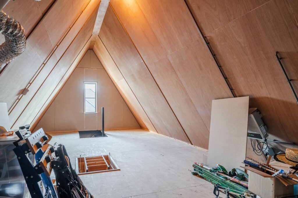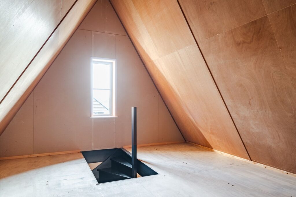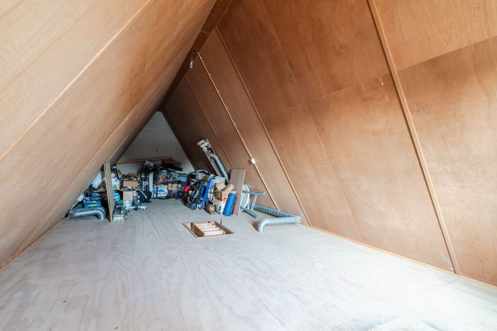 Further down the landing, a fixed staircase takes you to the second floor. Currently used as an attic, this space could be converted to create an additional bedroom, studio, workspace, etc.