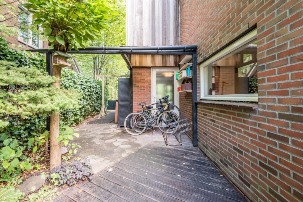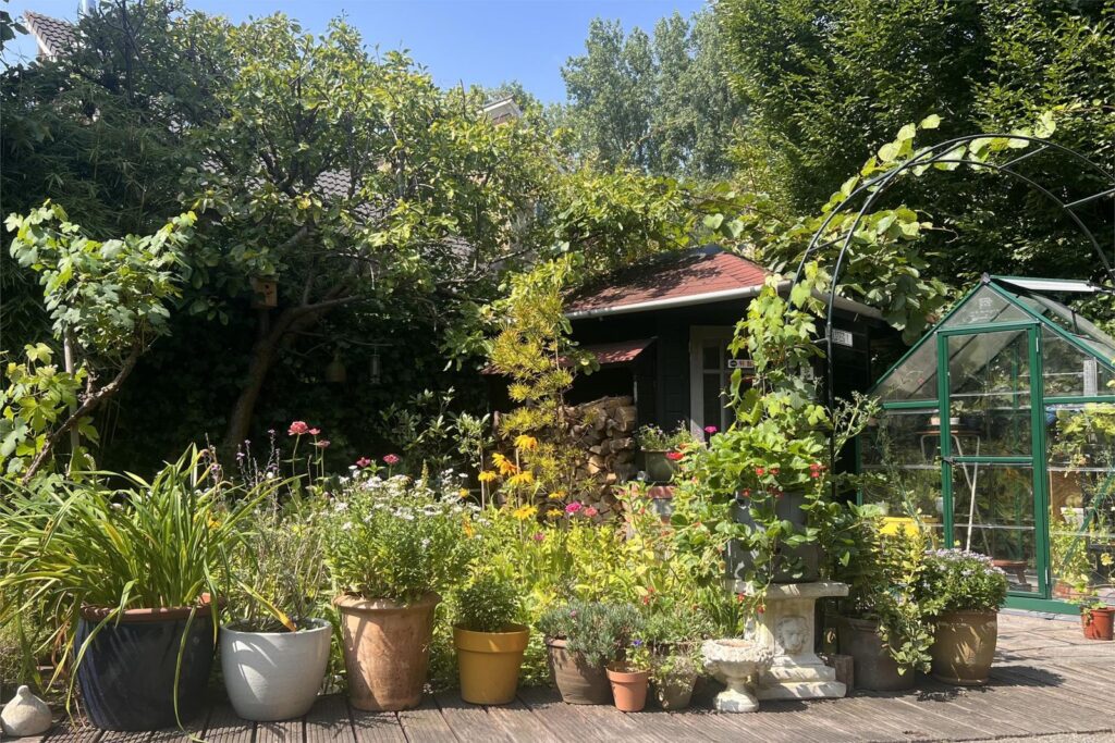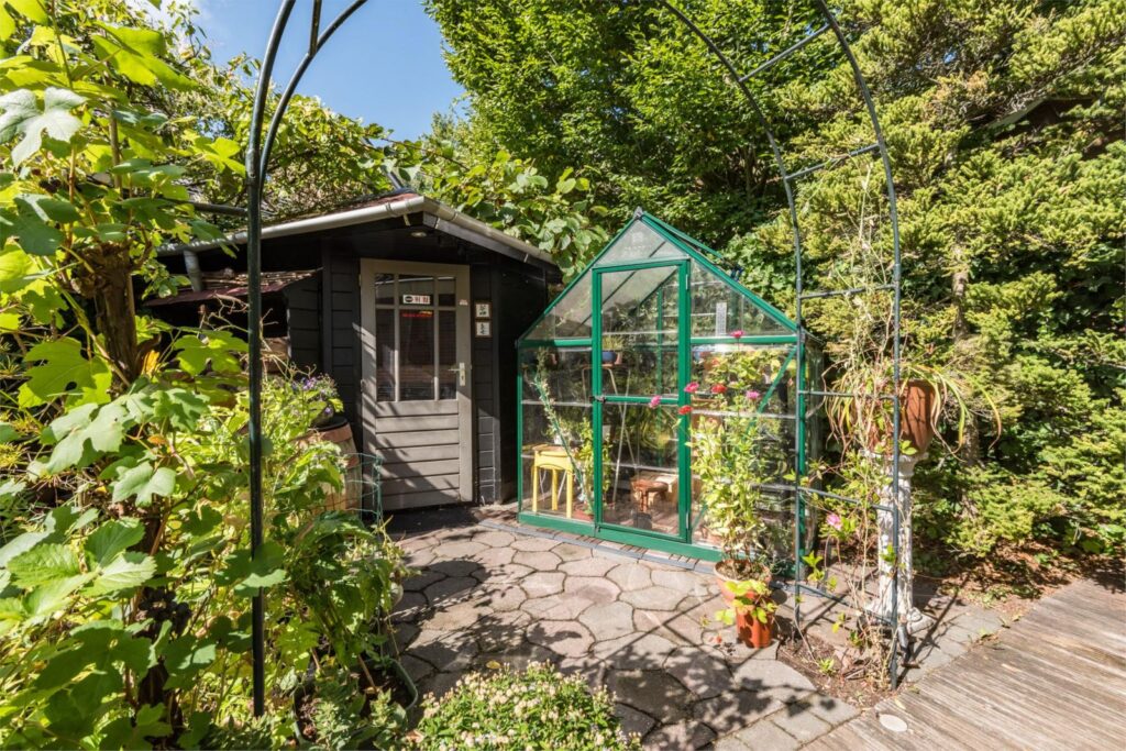 The sunny, sheltered southwest-facing backyard is beautifully landscaped and offers maximum privacy. Here you’ll find a detached shed (currently used as a workshop), a spacious greenhouse for growing vegetables, herbs, and plants, and a covered side area for bicycles or additional storage.