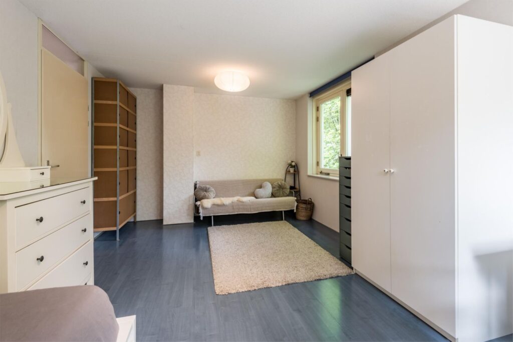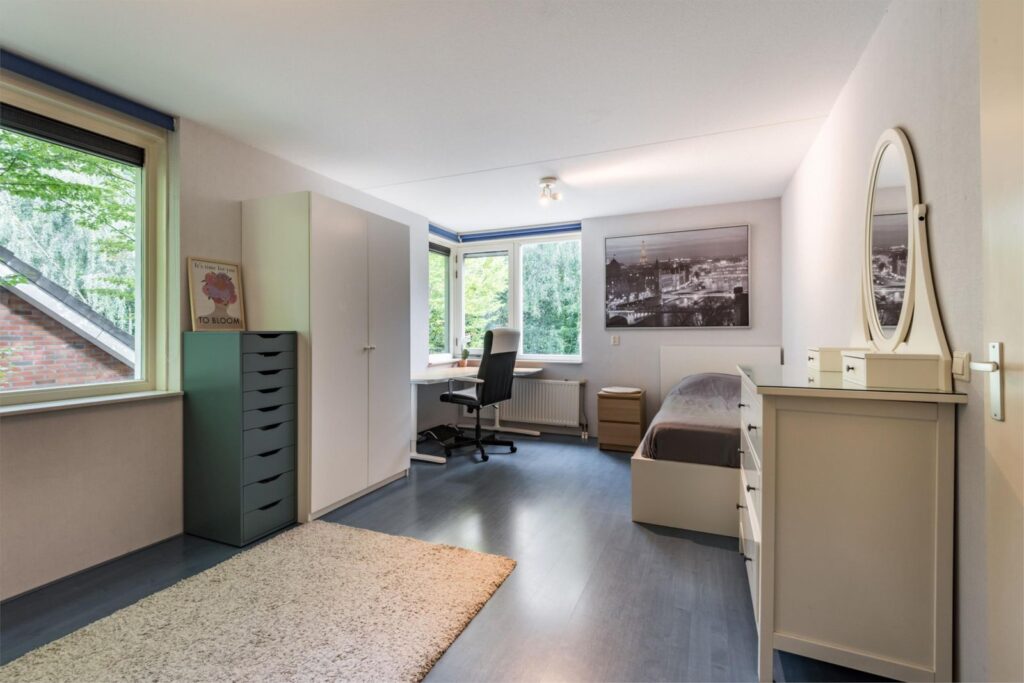 The second bedroom (approx. 18 m²) is also bright and spacious, with windows on two sides and lovely views of the Beginbos. If desired, this room can easily be divided into two separate bedrooms, as in the original layout.