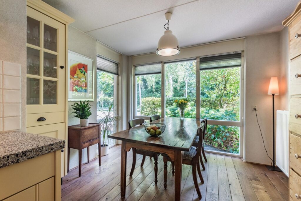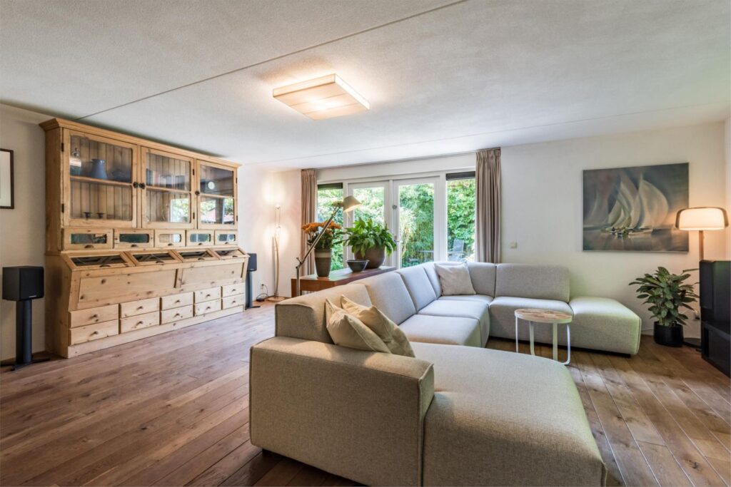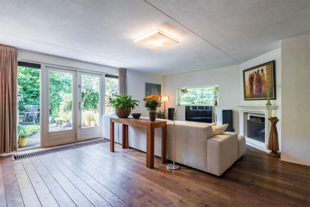 De woonkamer (ca. 33 m²) ligt aan de tuinzijde en valt op door de grote ramen en openslaande deuren, die zorgen voor een fijne verbinding met buiten en een ruimtelijk gevoel. Het vele natuurlijke licht en de rustige ligging geven de kamer een aangename sfeer. De open haard met klassieke stenen schouw vormt hierbij het warme middelpunt.