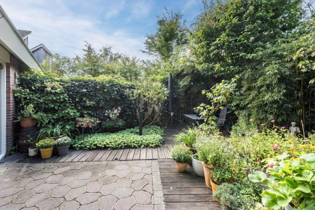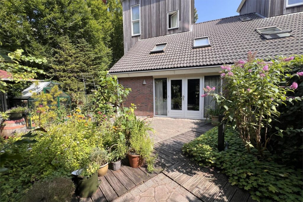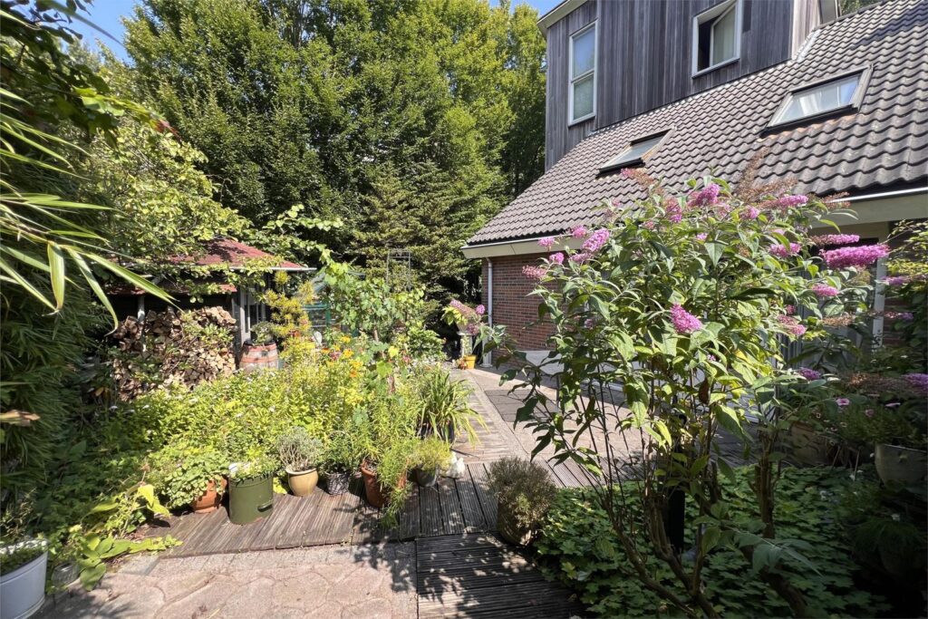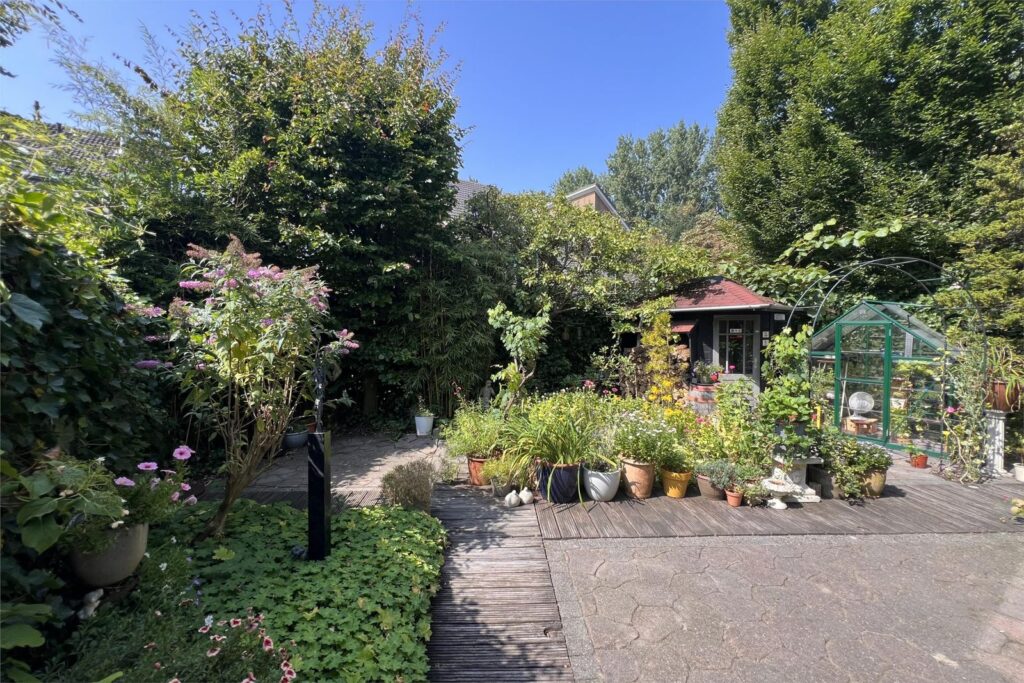 De zonnige beschutte achtertuin op het zuidwesten is fraai aangelegd en biedt optimale privacy. Hier vindt u een vrijstaande schuur (momenteel ingericht als werkplaats), een ruime kas voor het kweken van groente, kruiden en planten en een praktische overkapping aan de zijkant van de woning voor fietsen of opslag.