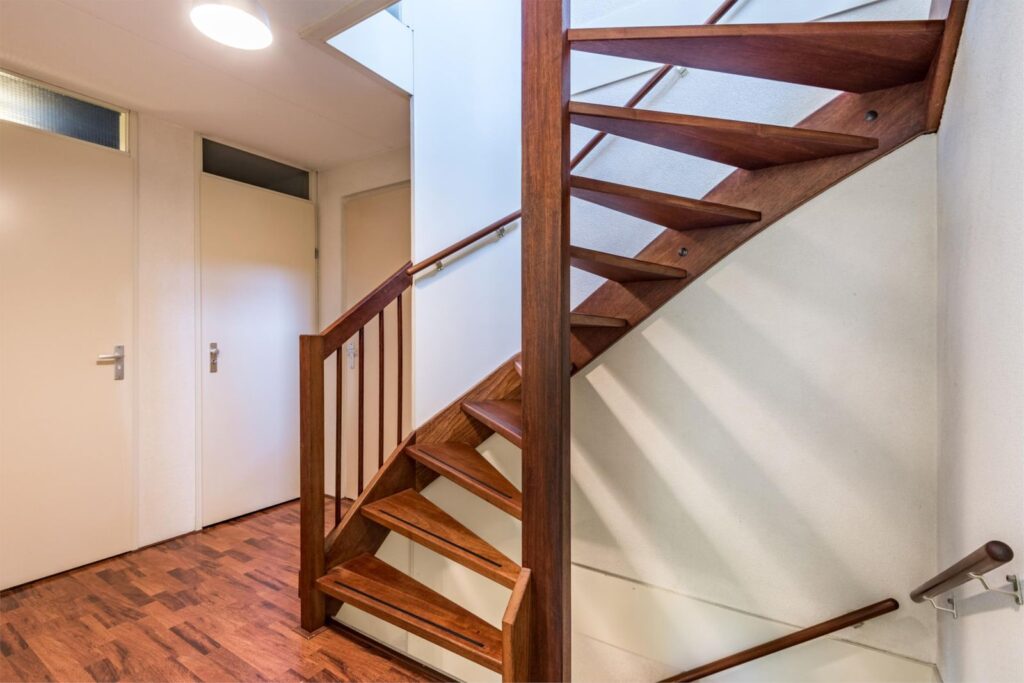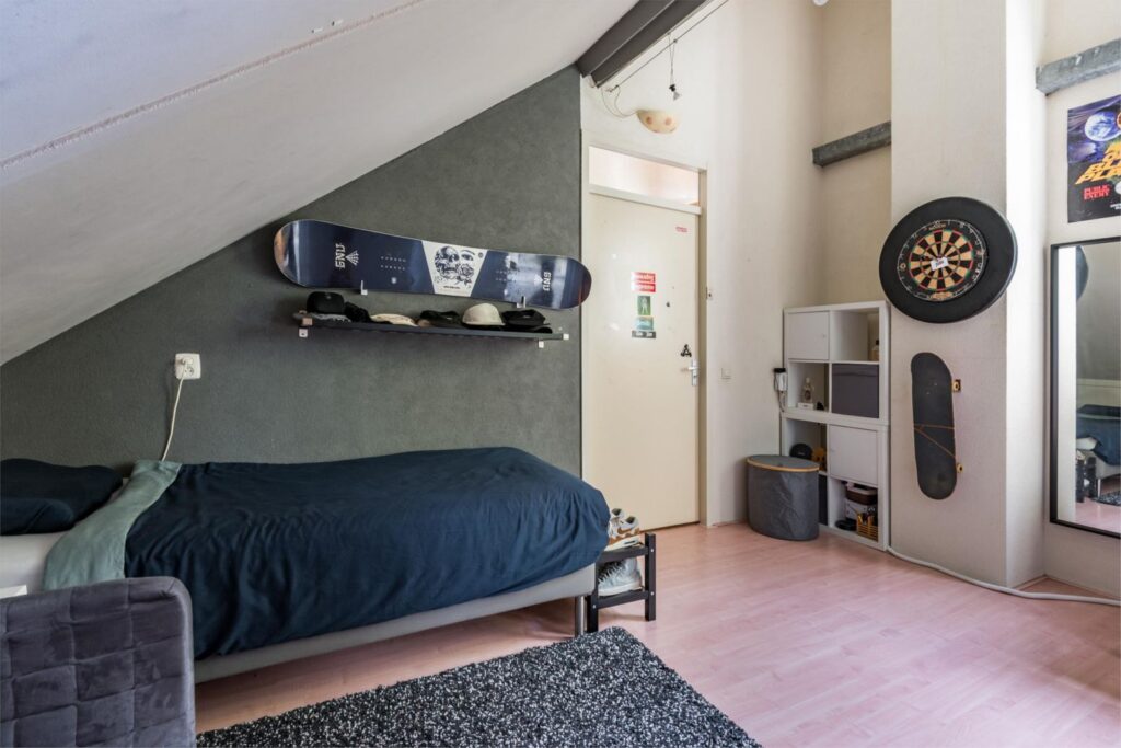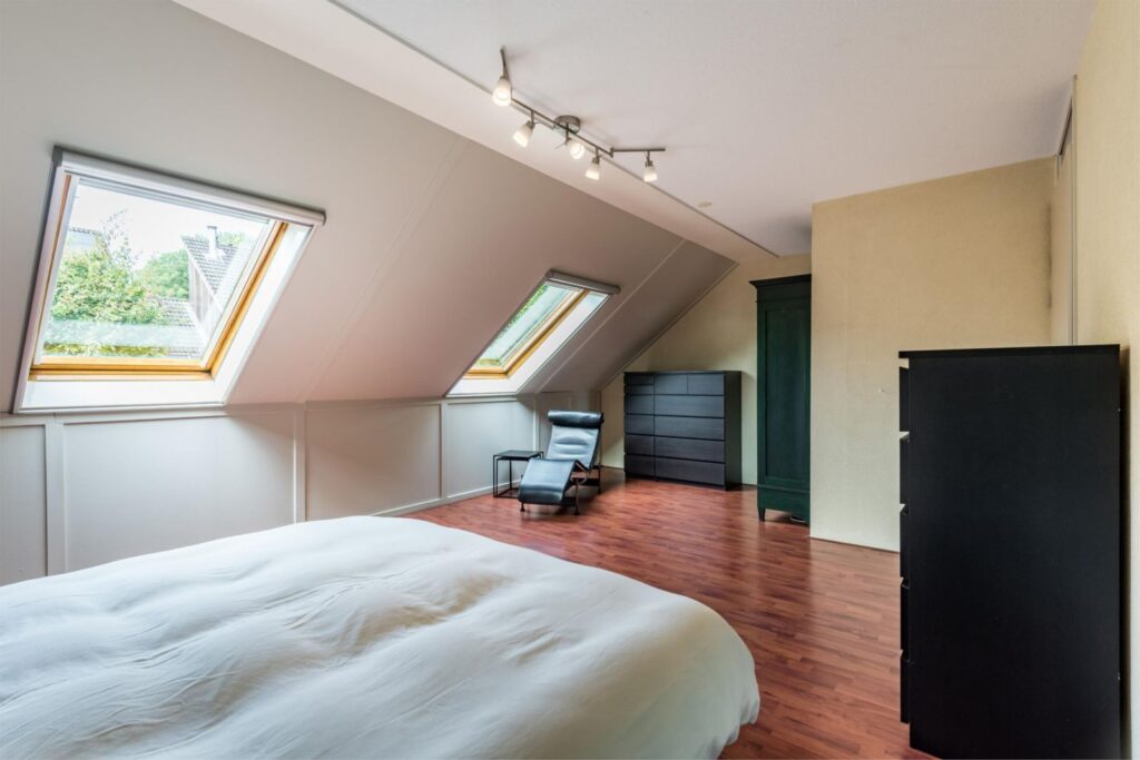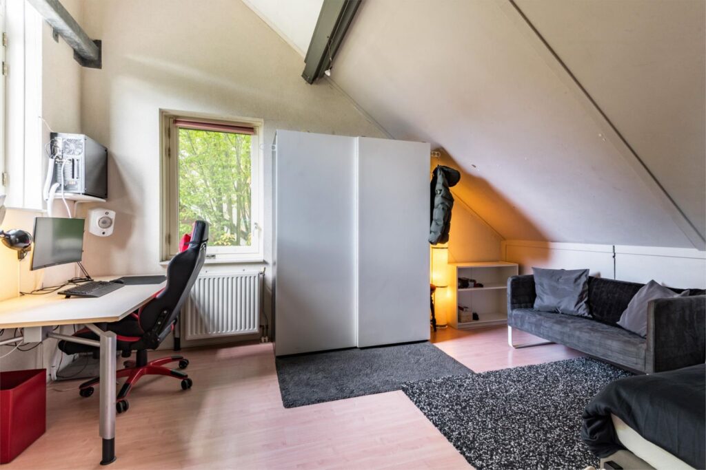A fixed staircase leads to the top floor, with a landing and access to a generous bedroom/hobby room (approx. 16 m²). The high ceiling and double windows up to the ridge create a bright, open feel. Behind the knee walls there is extra storage, making the room both charming and functional.