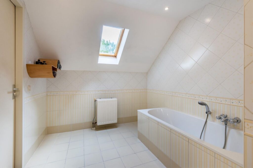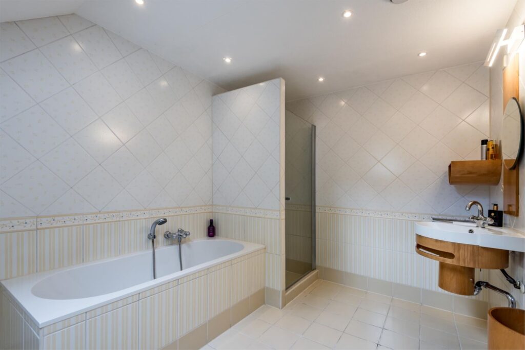 De sfeervolle badkamer is modern en compleet ingericht met ligbad, aparte douche, stijlvol wastafelmeubel en separaat tweede toilet met fonteintje.