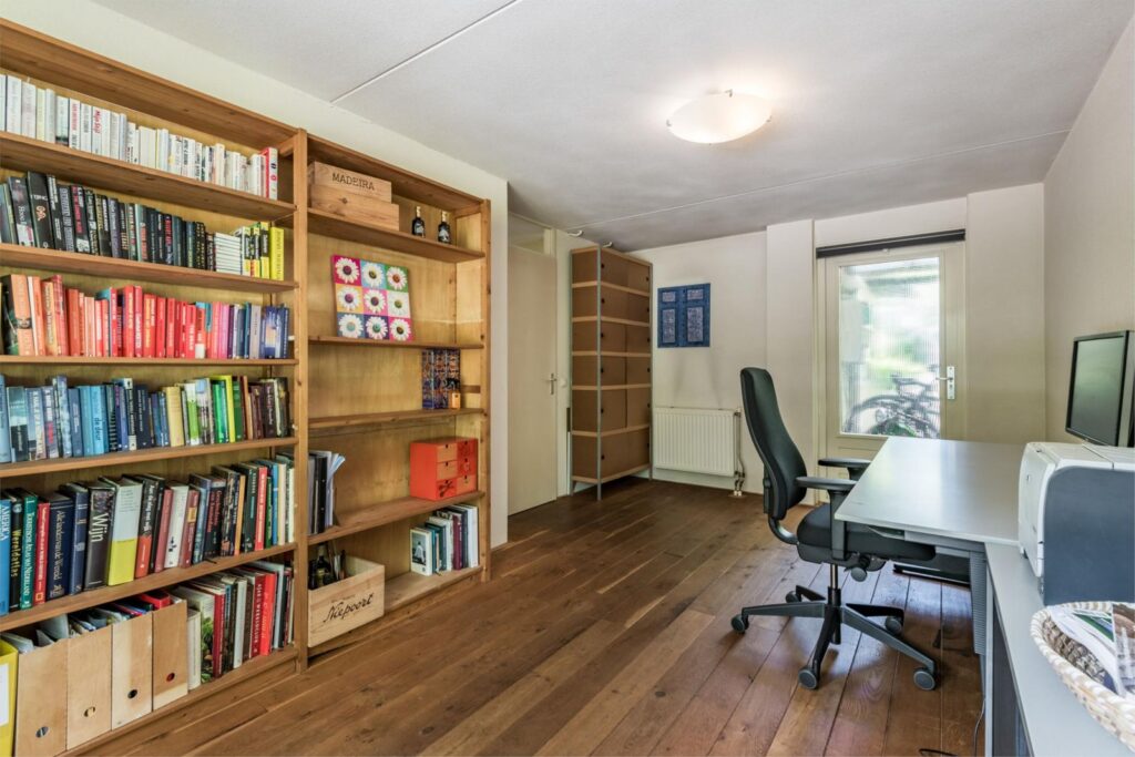 Aan de voorzijde van de woning bevindt zich een royale (werk)kamer van ca. 17 m², die vanuit de hal toegankelijk is en daarnaast beschikt over eigen toegangsdeuren aan zowel de voor- als achterzijde. Deze multifunctionele ruimte is ideaal als kantoor aan huis, speelkamer, atelier, studio of logeerkamer.