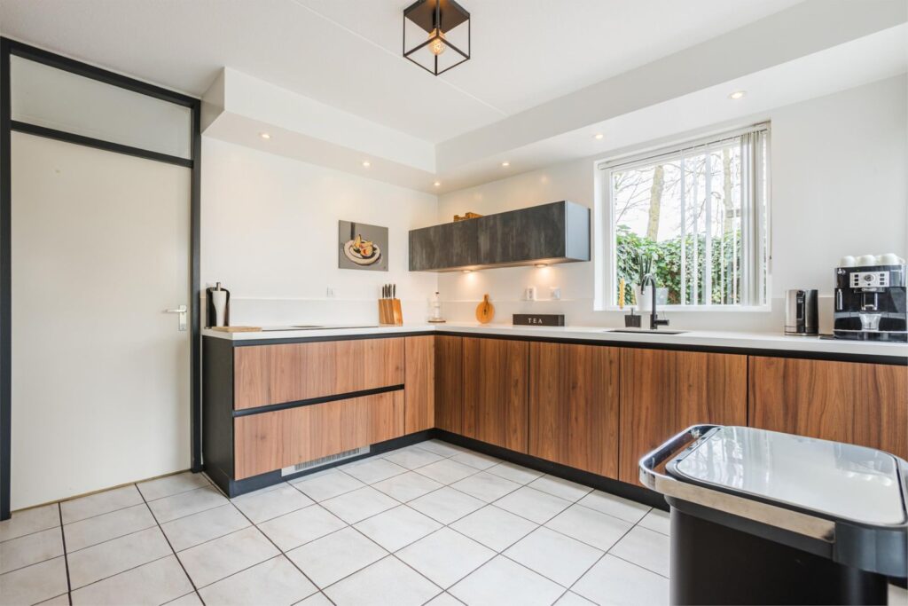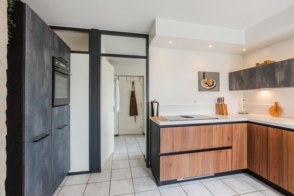 Aangrenzend aan de woonkamer vind je de moderne en ruime keuken (2022) met o.a. geïntegreerde afzuiging. Vanuit de keuken is de praktische bijkeuken bereikbaar, evenals de grote multifunctionele garage.