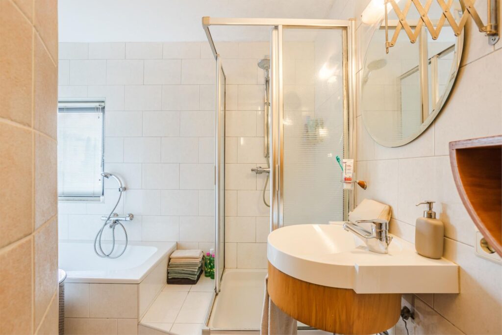 Eerste verdieping: Op de verdieping ligt een bijzonder vormgegeven (rond) badkamer, compleet met douchecabine, twee wastafels en een ruim ligbad. Verder zijn er drie goed bemeten slaapkamers.