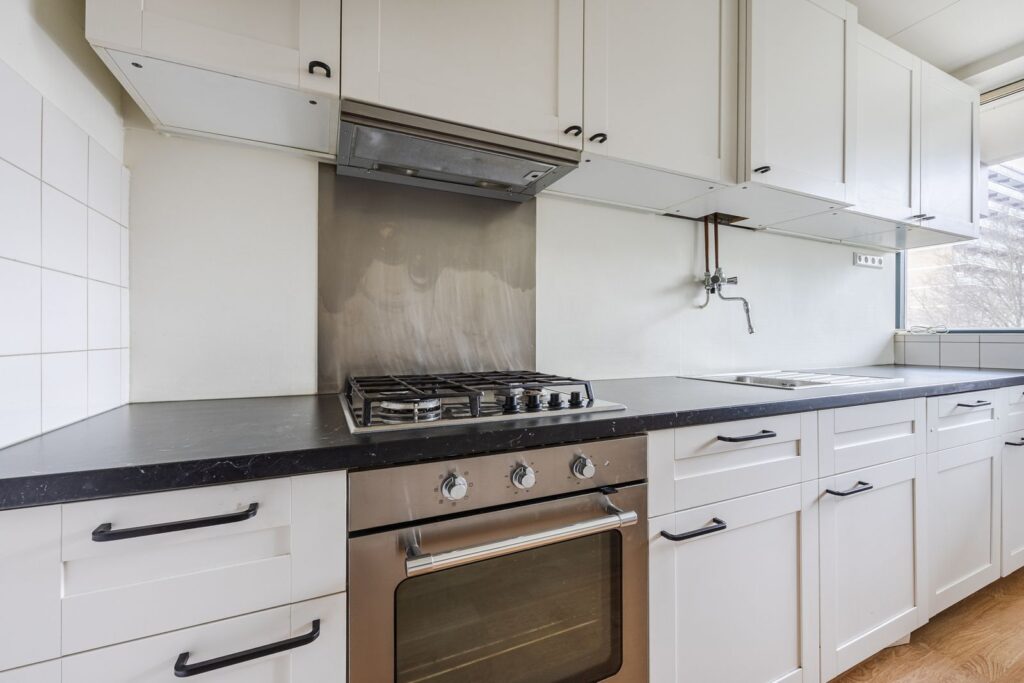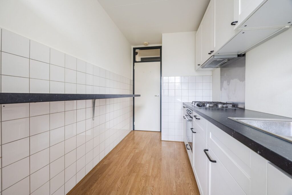 ?De ruime keuken, eveneens gelegen aan de galerijzijde, beschikt over een 4-pits gasstel met oven, vaatwasser, koel-vriescombinatie en een elektrische boiler (80 liter, huur).