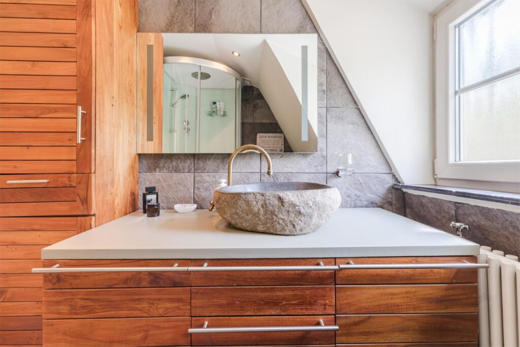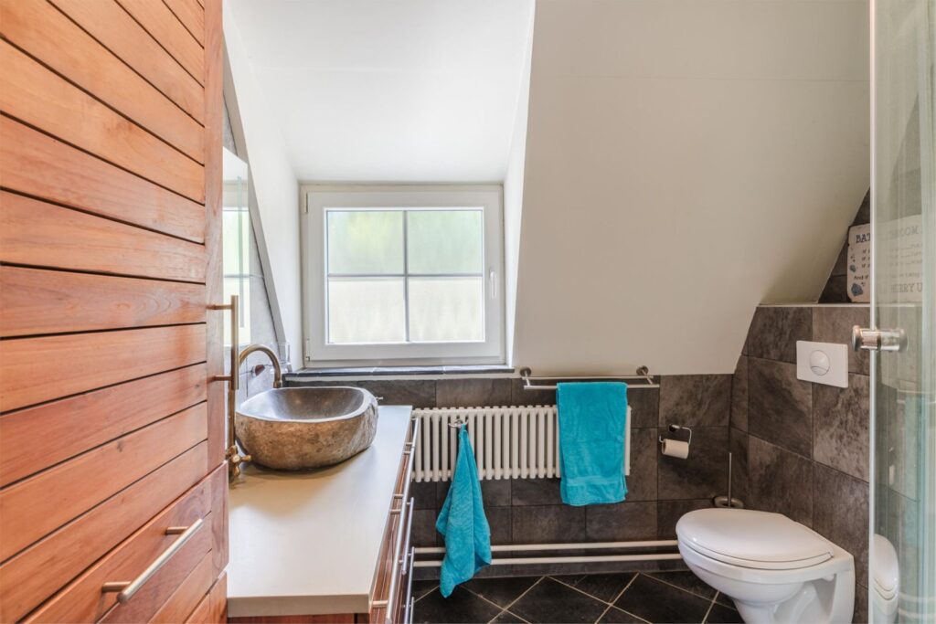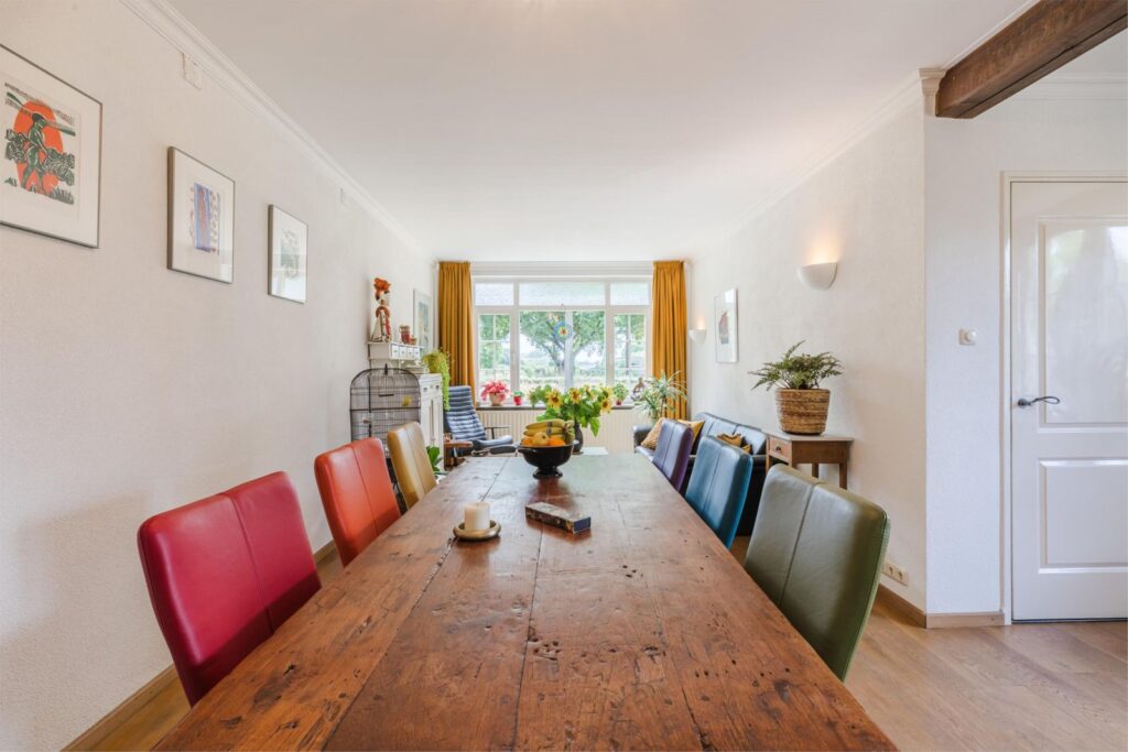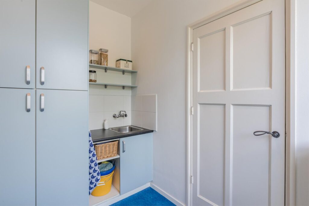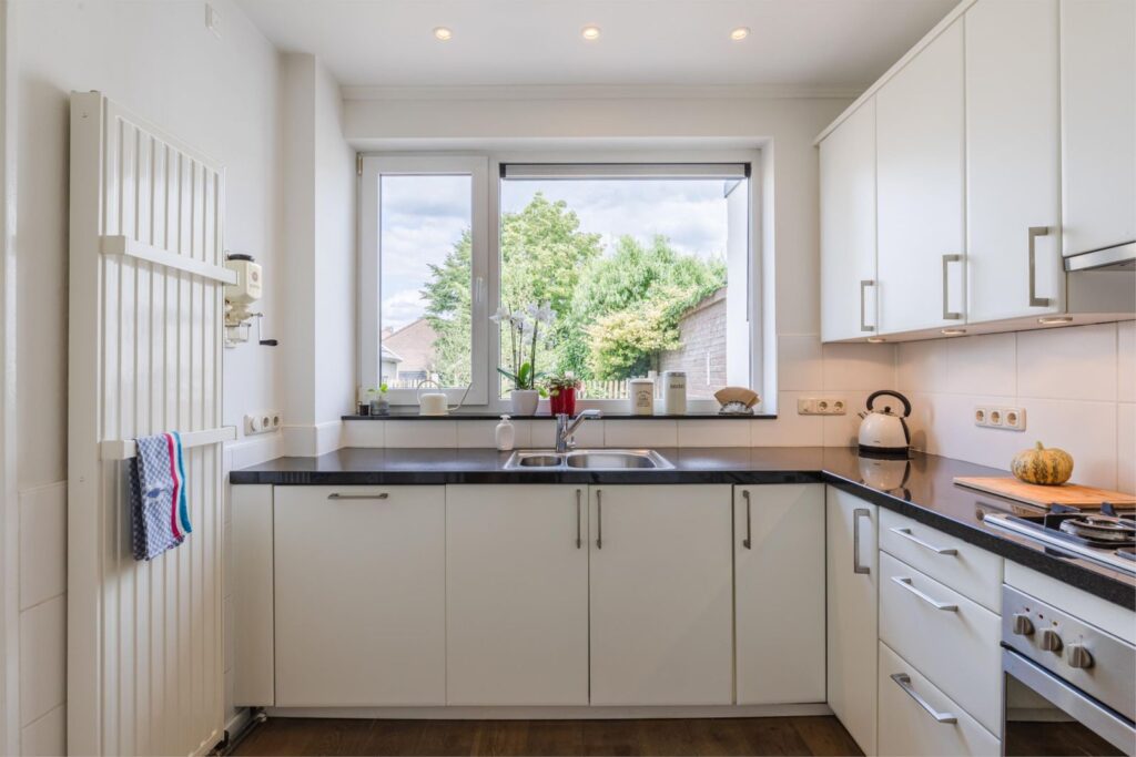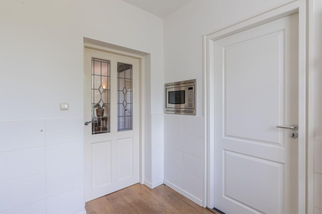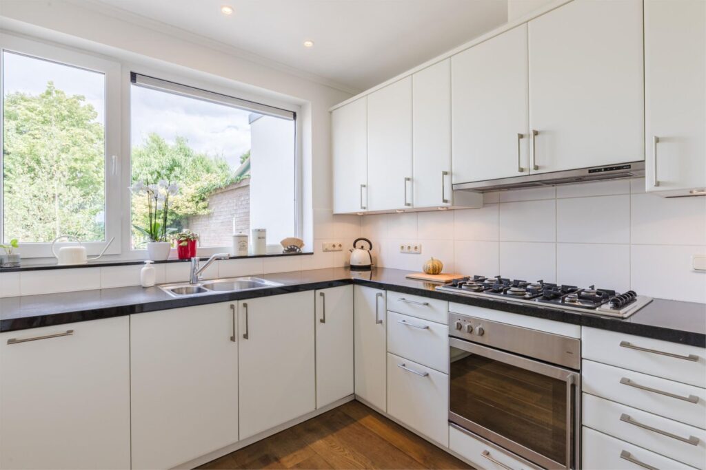 De keuken ligt in de aanbouw, waarvan de zijgevel en achtergevel in 2024 prachtig is afgewerkt met stucwerk (spachtelpleister) en geschilderd in RAL 9010. De keuken biedt een mooie combinatie in hoekopstelling met granieten aanrechtblad. De inbouwapparatuur bestaat uit een 6-pits gasfornuis, afzuigkap, oven, ingebouwde inbouw combi-oven, koelkast, vriezer en een vaatwasser. Vanuit de keuken is er een fraai en vrij uitzicht op de groene tuin. Via de achterdeur kom je in een praktische hal met bijkeuken die is voorzien van een werkblad, wastafel, kastenwand en toegang tot de keuken, maar ook de berging met opstelling cv- combiketel (Remeha HR, 2014 huur t/m 2026) en witgoedaansluitingen.