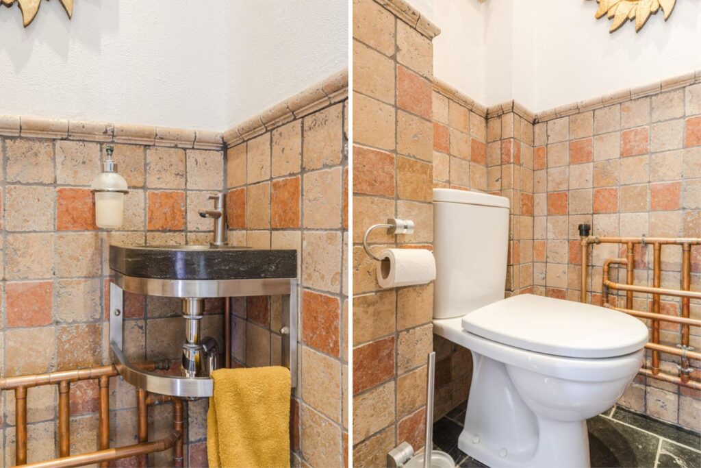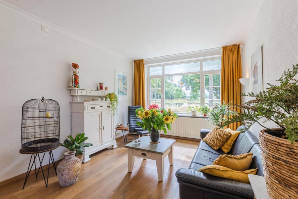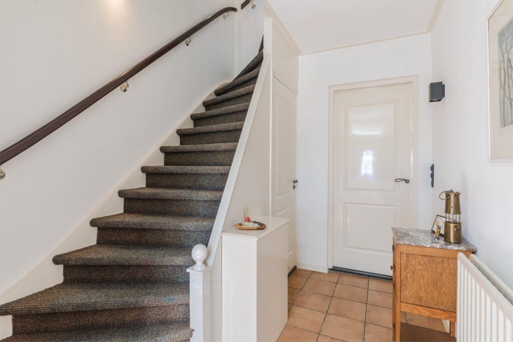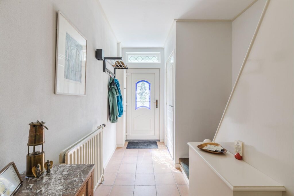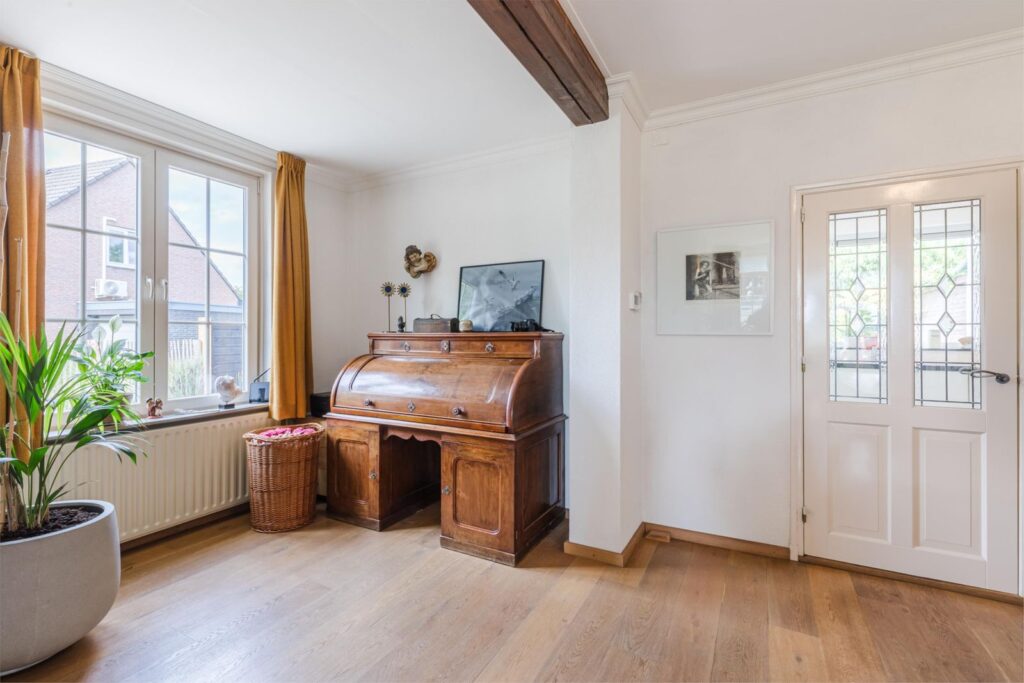 De hal/entree is voorzien van natuursteentegels en biedt toegang tot een fraai uitziende toiletruimte met toilet en fonteintje, de meterkast met elektrische groepen, kelder en L-vormige woonkamer voorzien van een massief eikenhouten vloer en geeft een heerlijk vrij uitzicht. De doorgaande weg is vanwege de isolatie niet of nauwelijks hoorbaar.