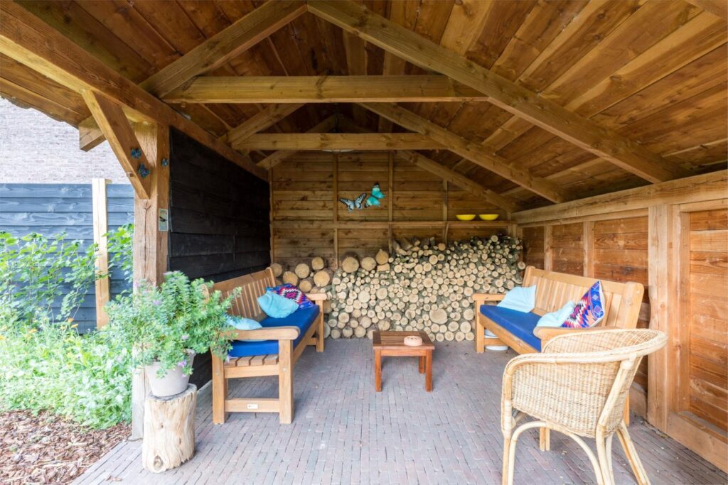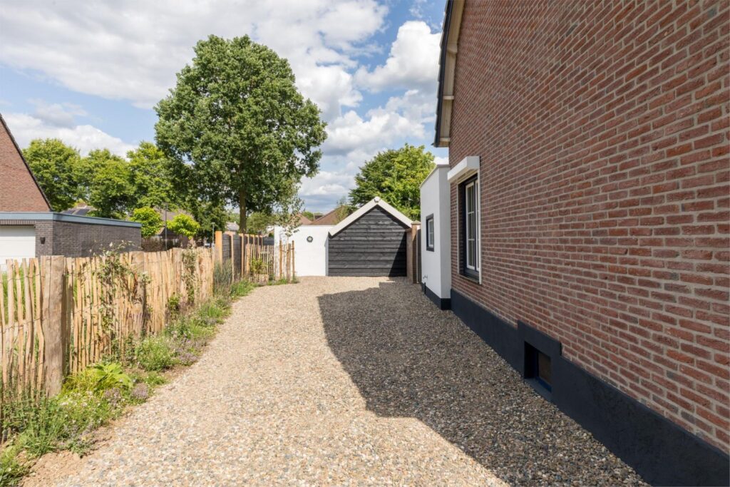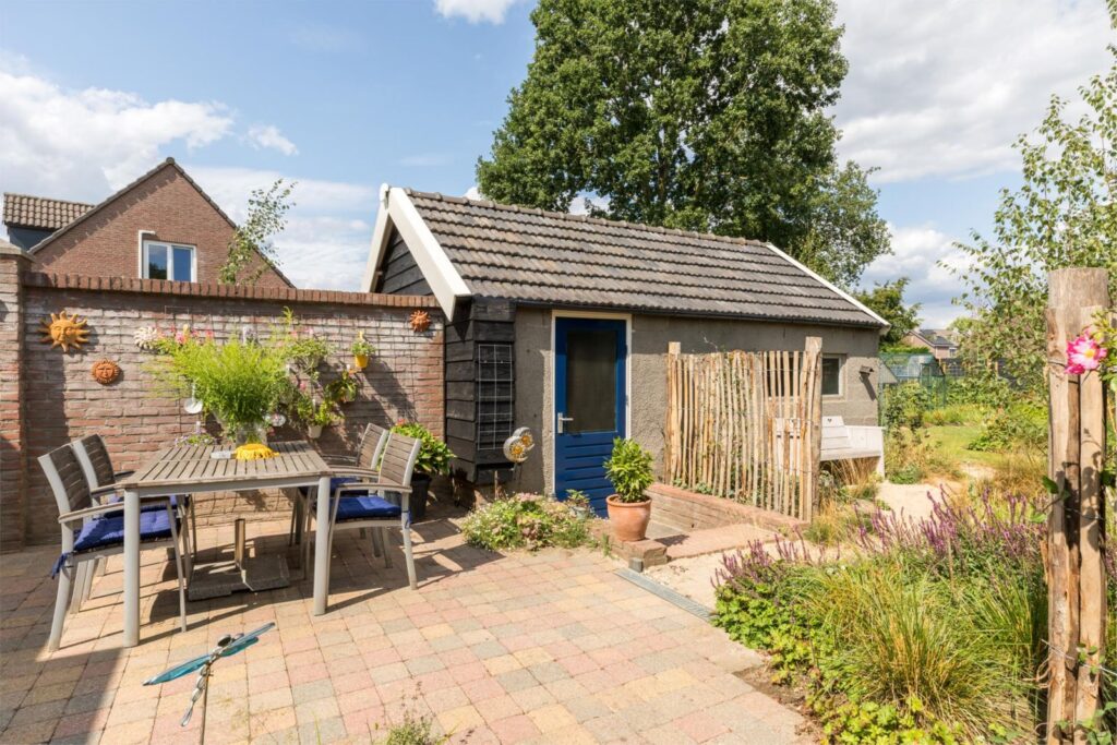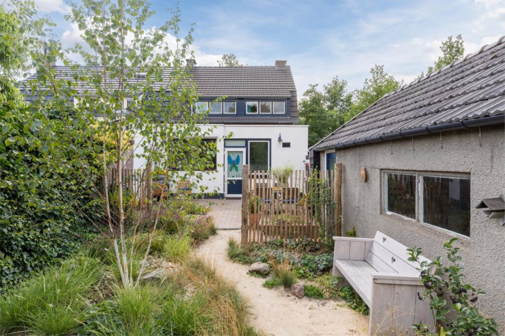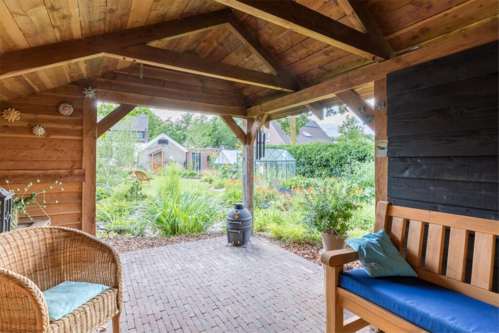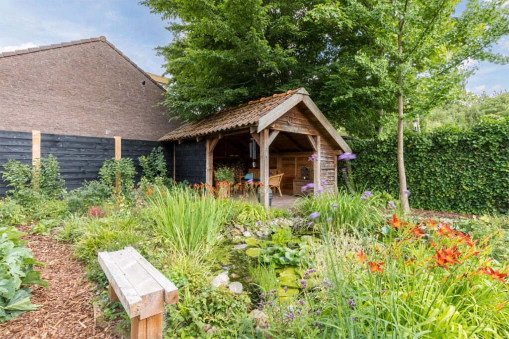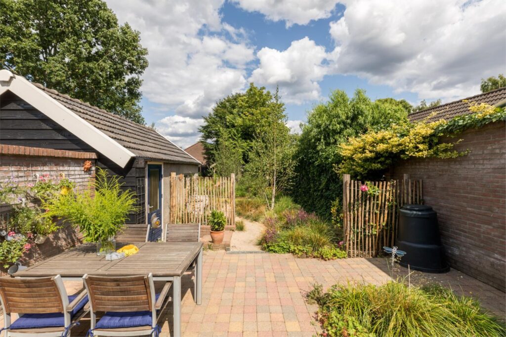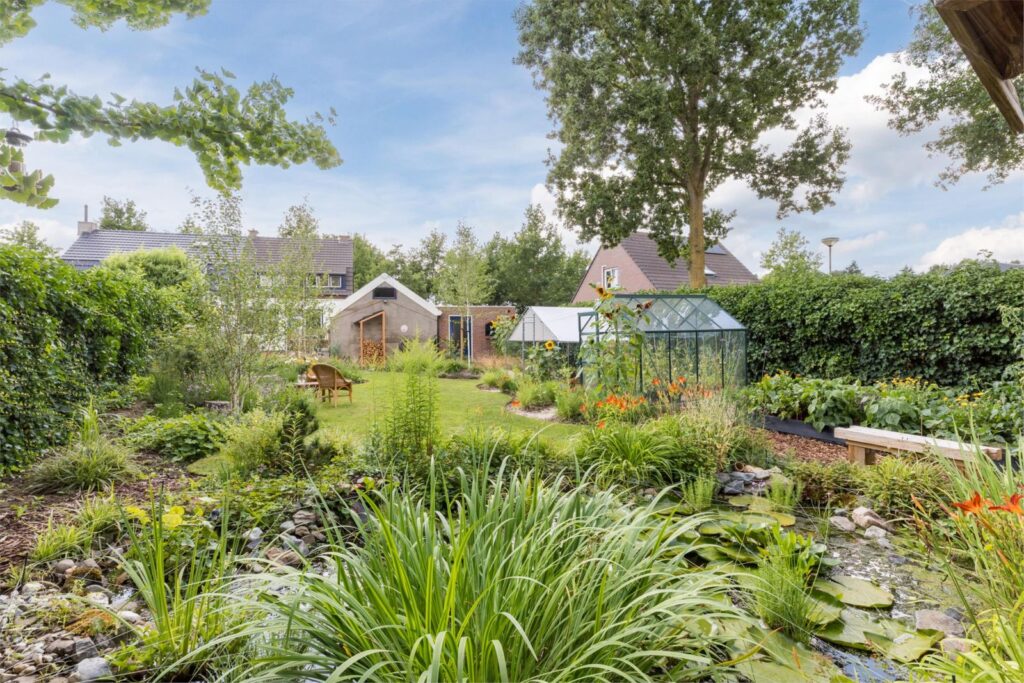 De onderhoudsvriendelijke voortuin staat in verbinding met de zijtuin. De afscheiding aan de opritzijde is in 2025 gerealiseerd i.v.m. aankoop grond gemeente. De ruime en diepe oprit leidt naar de riante vrijstaande garage/schuur die aan de voorzijde fraai is afgewerkt met zwart Zweeds rabat. Aangrenzend een dubbele berging met platdak. De prachtige onderhoudsvriendelijke achtertuin is werkelijk een plaatje; een bloeiende en groene oase met ruim gazon, speels met natuurlijk verhoogde borders, terrassen, een natuurvijver, een kippenren, moestuin en glazen kweekkast. Onder de overdekte robuuste overkapping is het heerlijk toeven met een prachtig uitzicht over de fraaie natuurtuin die veel privacy biedt.
