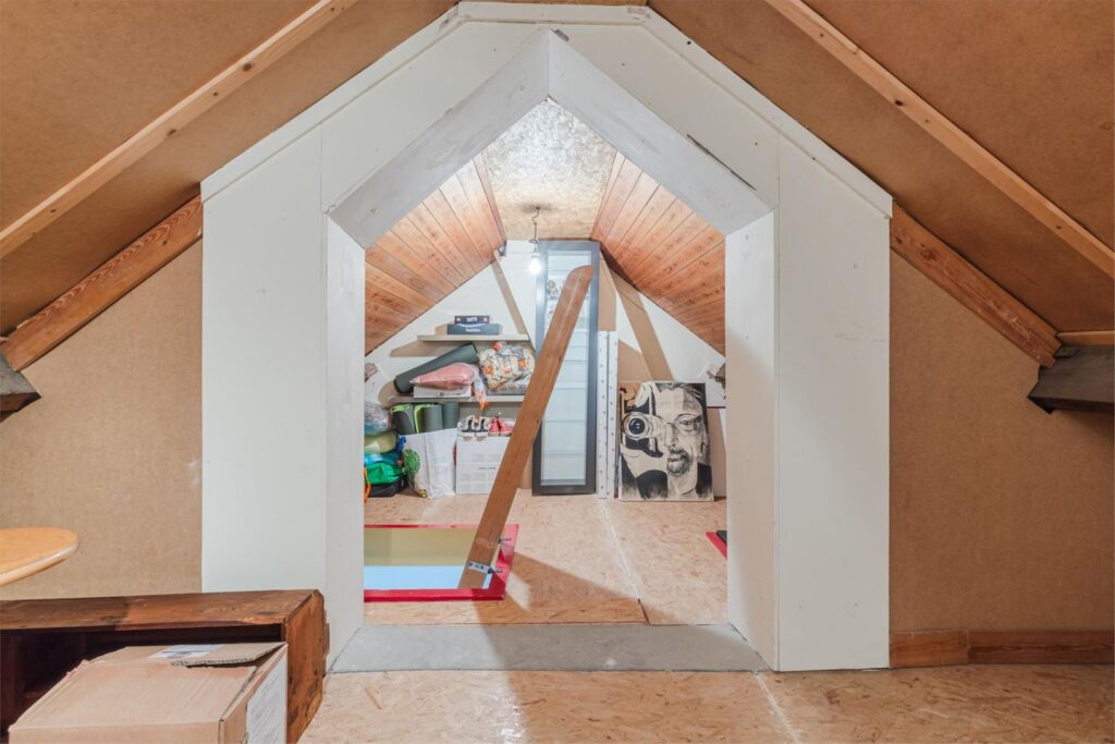 Middels een vlizotrap is deze ruime bergzolder te bereiken en is deels voorzien van een kastenwand.