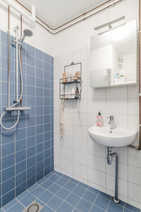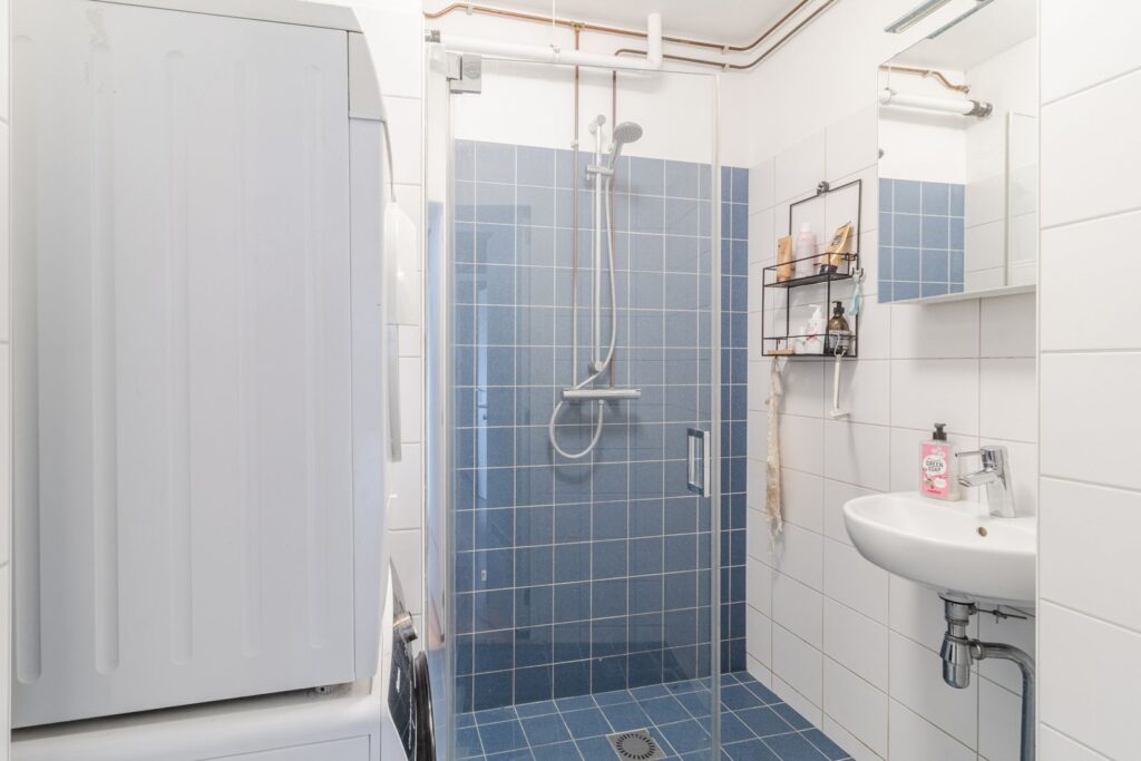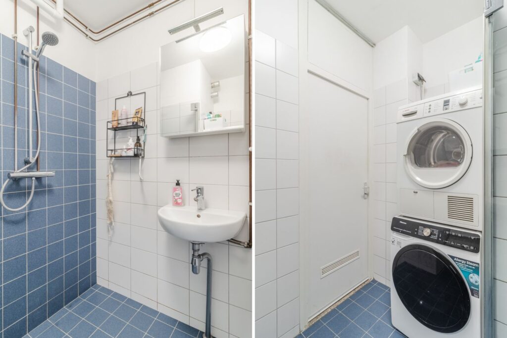 De badkamer is praktisch ingericht met een inloopdouche, vaste wastafel met meubel, spiegelkast en opstelplaats voor de wasmachine. Daarnaast is er een toiletruimte met fonteintje.