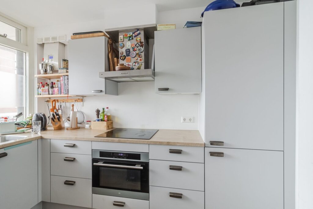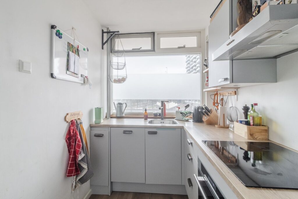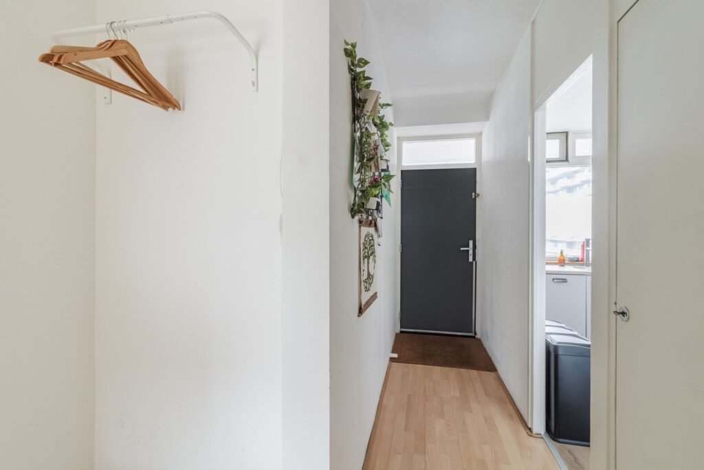 Entree van de woning met hal, gang en meterkast. De moderne keuken (L-opstelling) is ingedeeld en voorzien van veel werk en bergruimte en diverse inbouwapparatuur (oven, magnetron, vaatwasser, koel-/vriescombinatie, afzuigkap en een 4 pits inductiekookplaat).