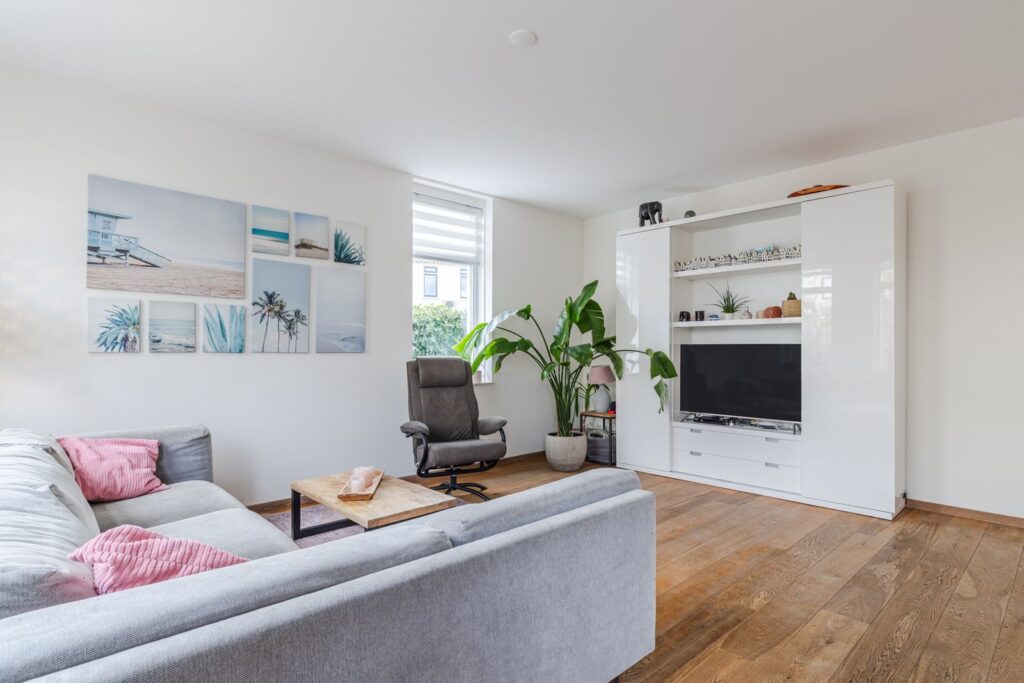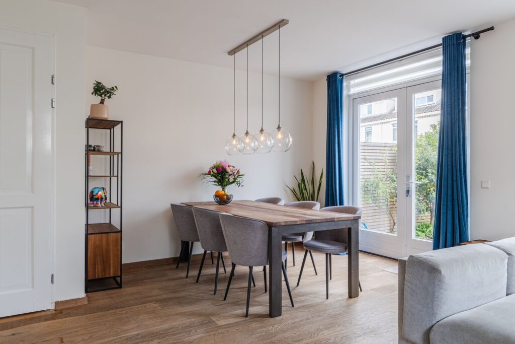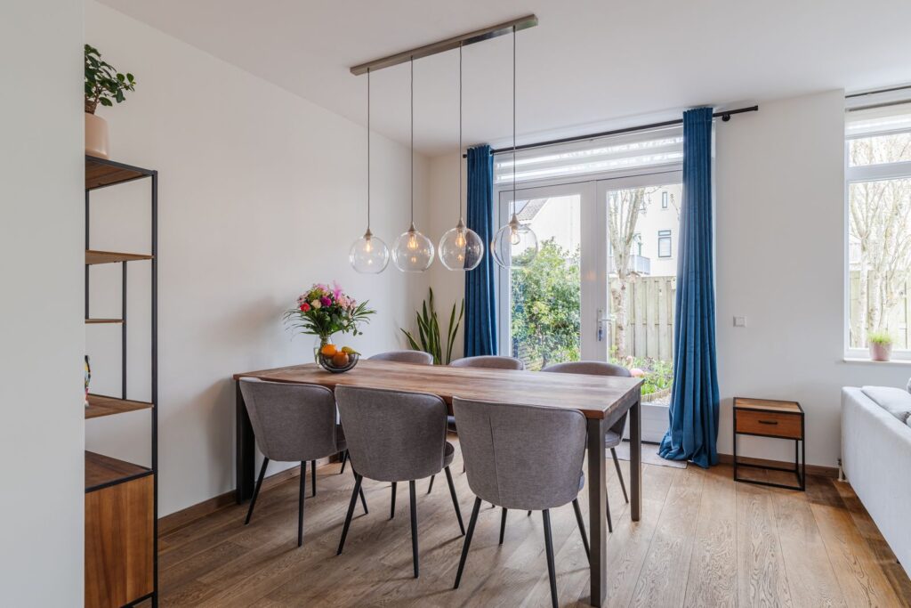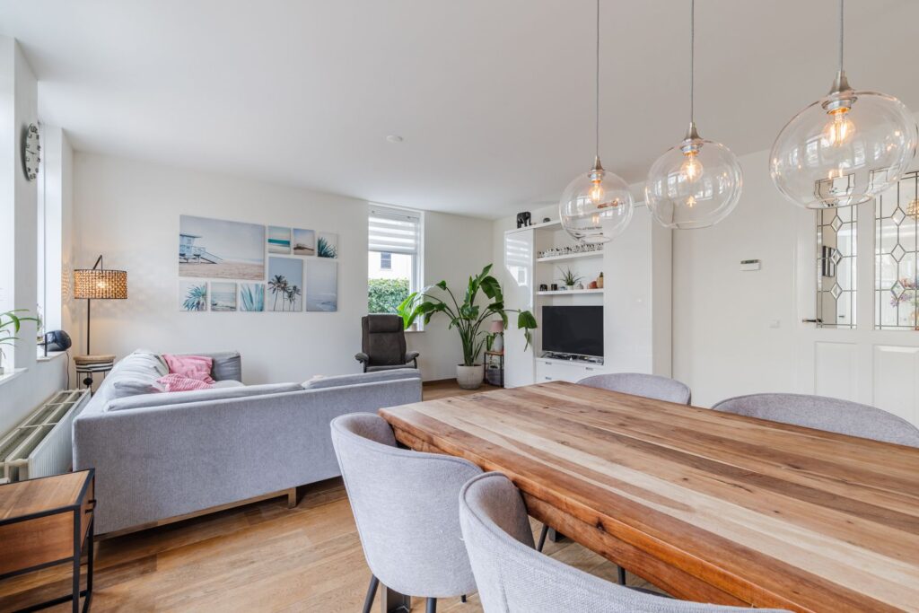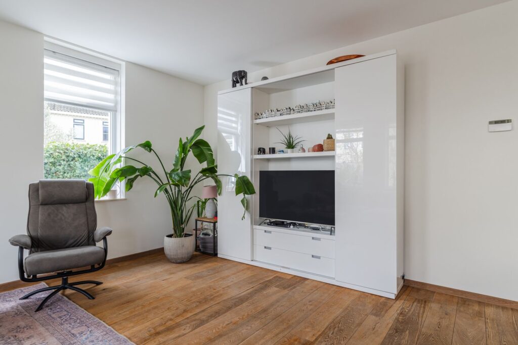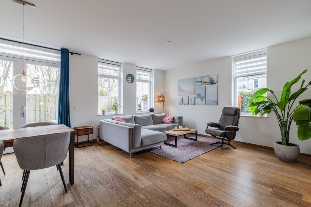 De royale woonkamer aan de achterzijde is heerlijk licht dankzij de grote raampartijen en de directe verbinding met de tuin. De ruimte voelt open en comfortabel aan en biedt volop mogelijkheden voor een gezellige zithoek en ruime eethoek. De woonkamer is voorzien van een eiken houten vloer en gestuukte plafonds. De praktische trapkast zorgt voor extra opbergruimte. Vanuit de woonkamer stap je direct de tuin in via de openslaande deuren.