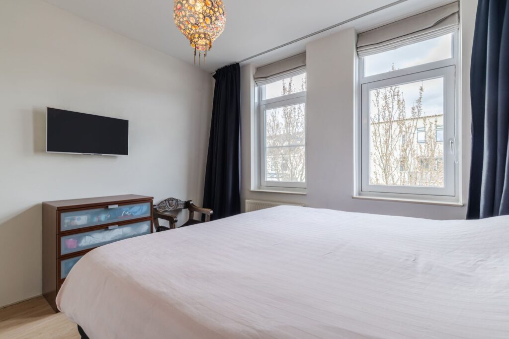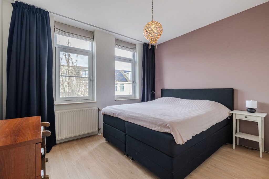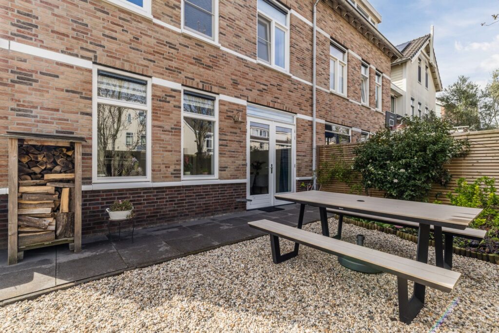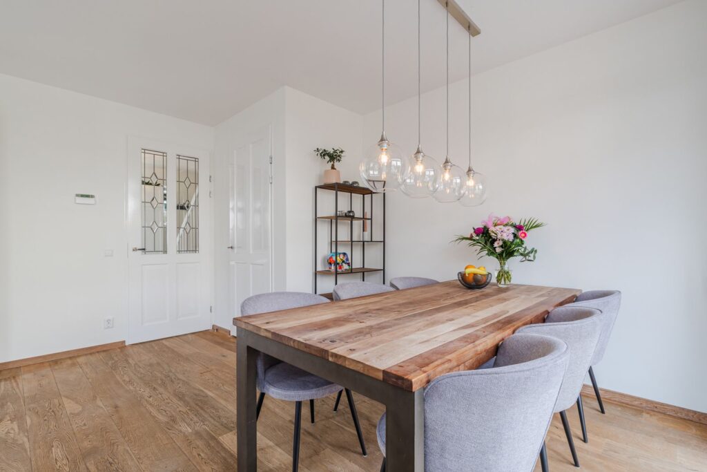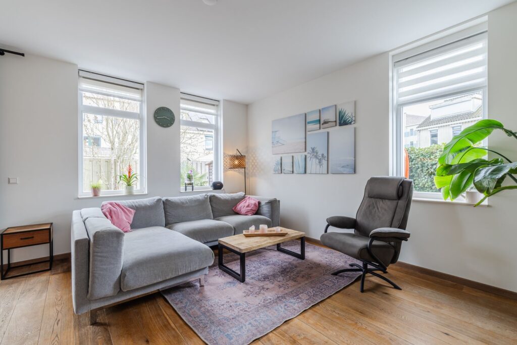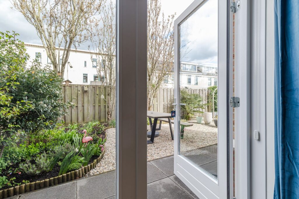 De royale woonkamer aan de achterzijde is heerlijk licht dankzij de grote raampartijen en de directe verbinding met de tuin. De ruimte voelt open en comfortabel aan en biedt volop mogelijkheden voor een gezellige zithoek en ruime eethoek. De woonkamer is voorzien van een eiken houten vloer en gestuukte plafonds. De praktische trapkast zorgt voor extra opbergruimte. Vanuit de woonkamer stap je direct de tuin in via de openslaande deuren.
