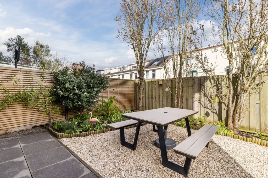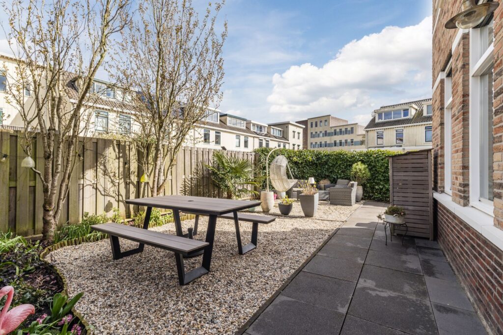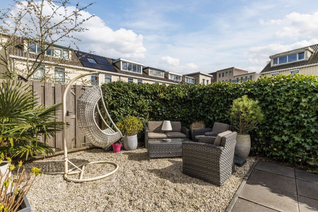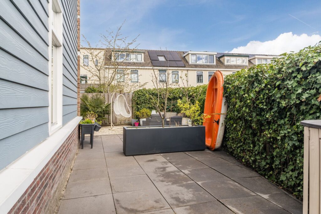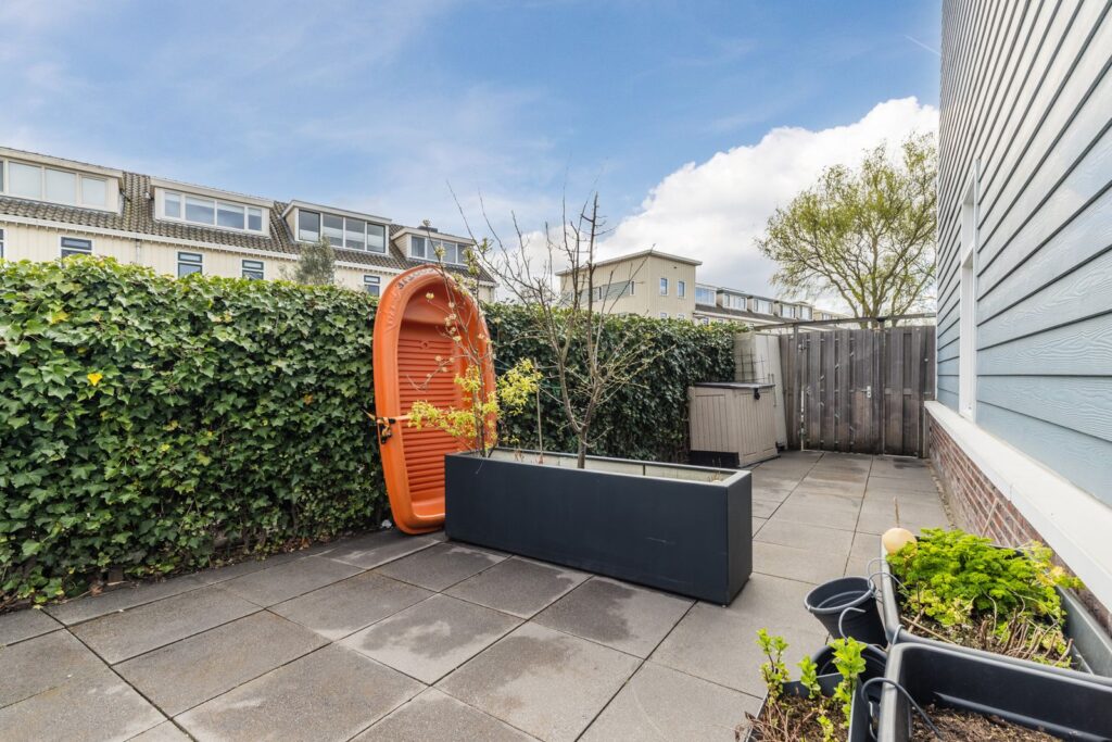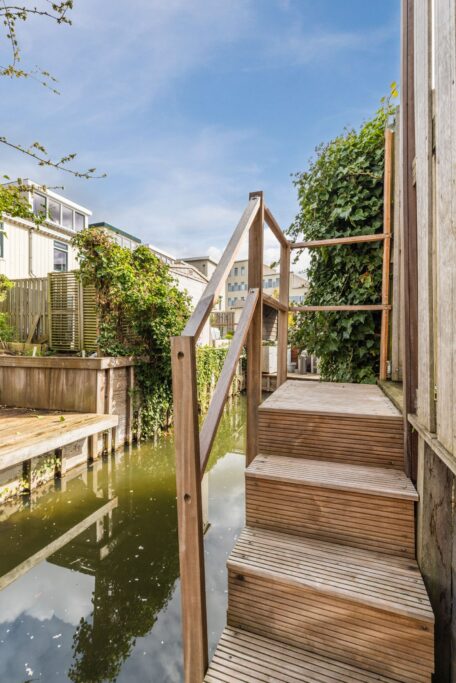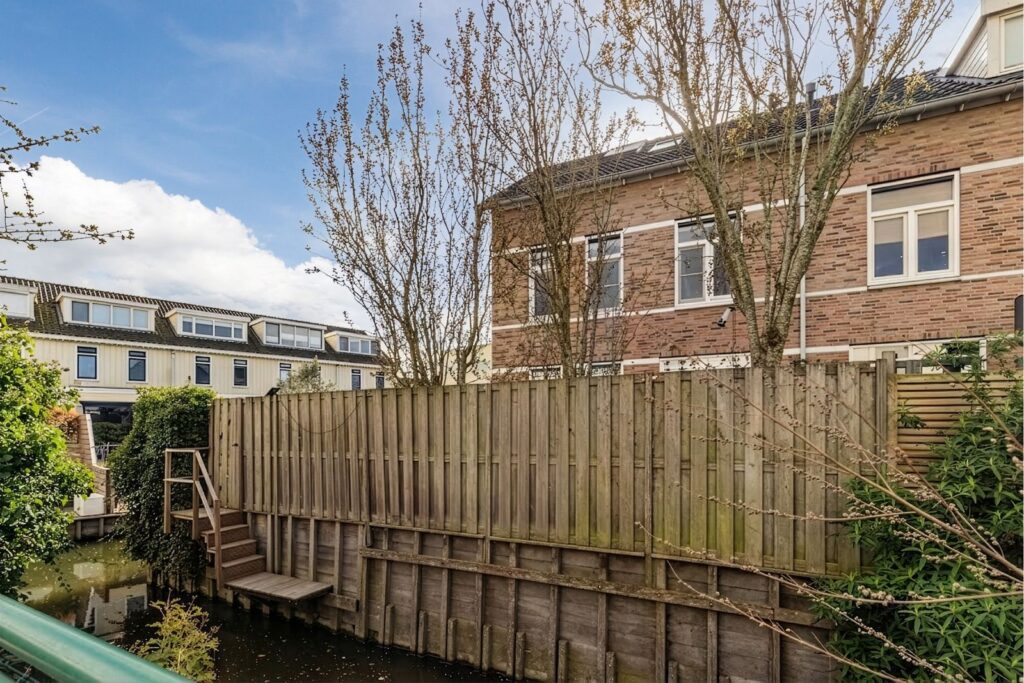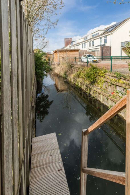 De woning beschikt over een royale, zonnige zij- en achtertuin (zuid/oost) die met een poort kan worden afgesloten. De achtertuin is een heerlijke plek om te ontspannen en te genieten van het buitenleven, met voldoende ruimte voor een loungeset of grote eettafel. De achtertuin is voorzien van elektra. De eigen steiger maakt deze woning extra bijzonder en biedt directe mogelijkheden om te varen of te suppen — een unieke toevoeging aan uw wooncomfort.