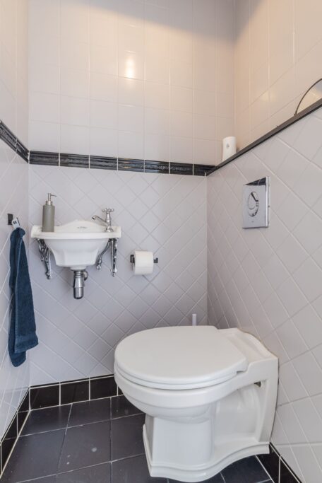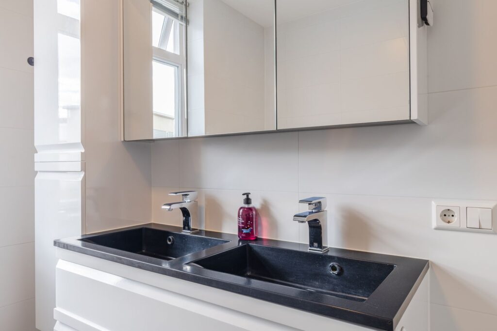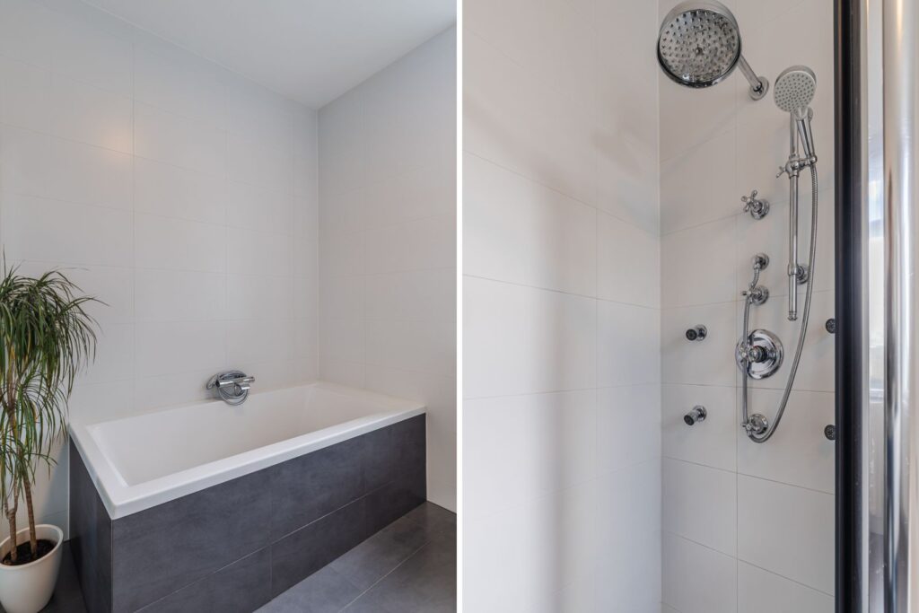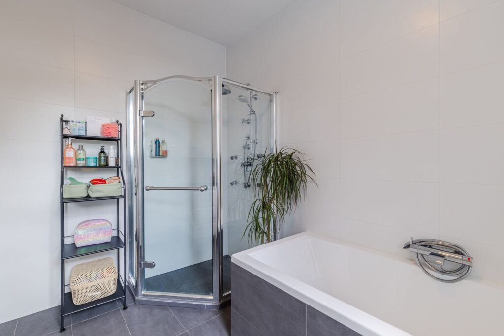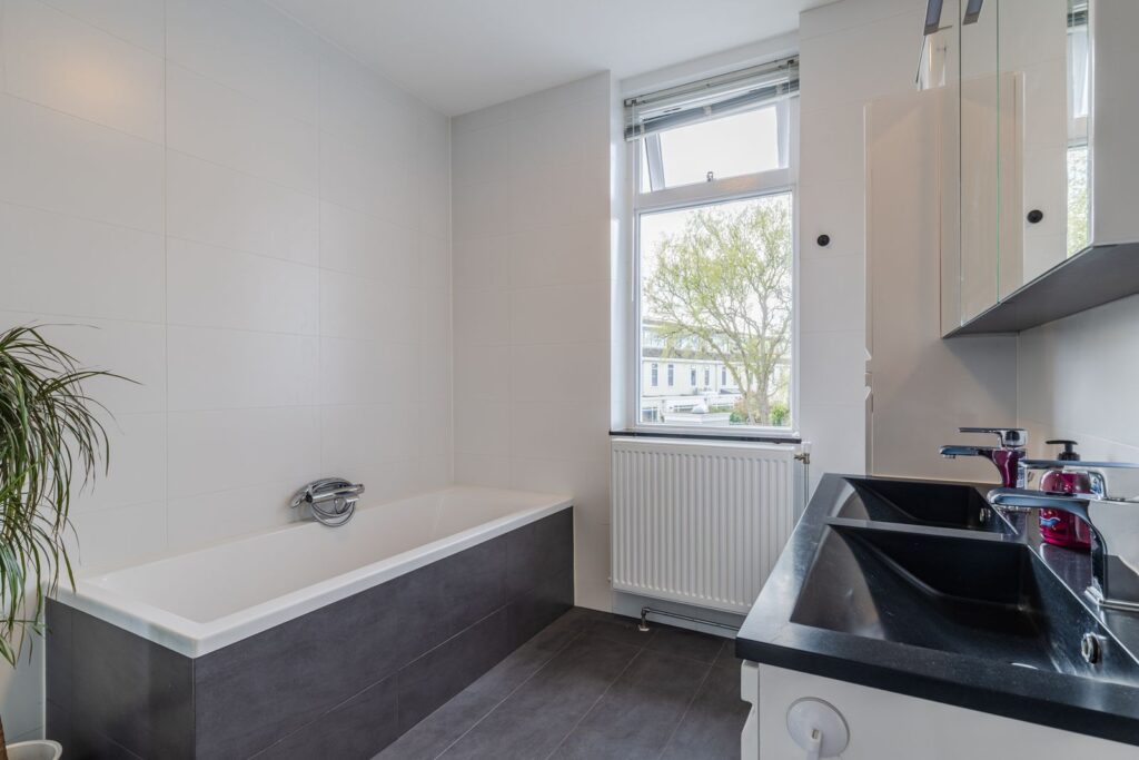De moderne en volledig betegelde badkamer is compleet uitgevoerd en voorzien van een ruime douchecabine, ligbad, wastafelmeubel, badkamerkast en een raam ten behoeve van daglicht en extra ventilatie. Een fijne, verzorgde ruimte met een luxe uitstraling.