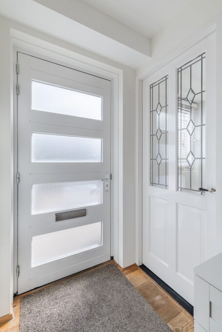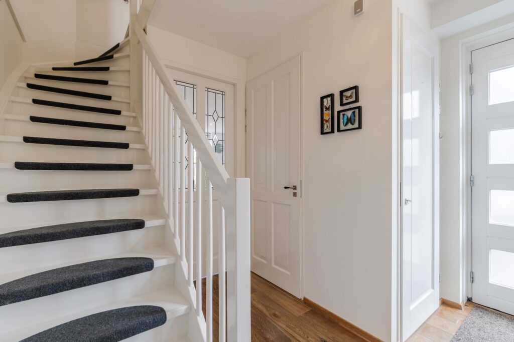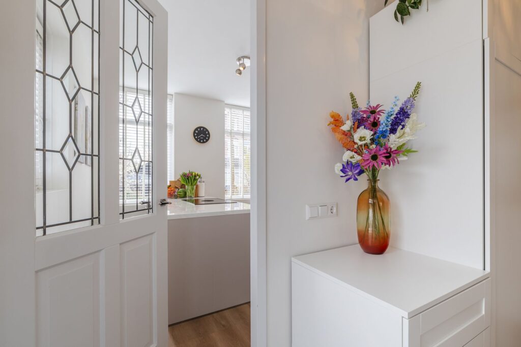 Via de verzorgde voortuin met oprit (eigen parkeergelegenheid) komt u binnen in de royale hal. Hier vindt u het toilet, de meterkast, de trapopgang en toegang tot de leefruimtes. De hal is licht en biedt voldoende ruimte voor een garderobe.