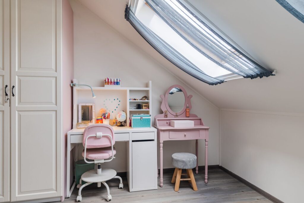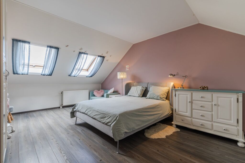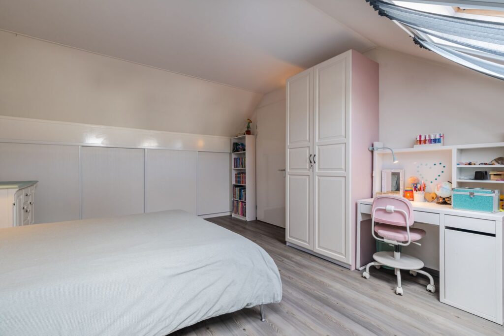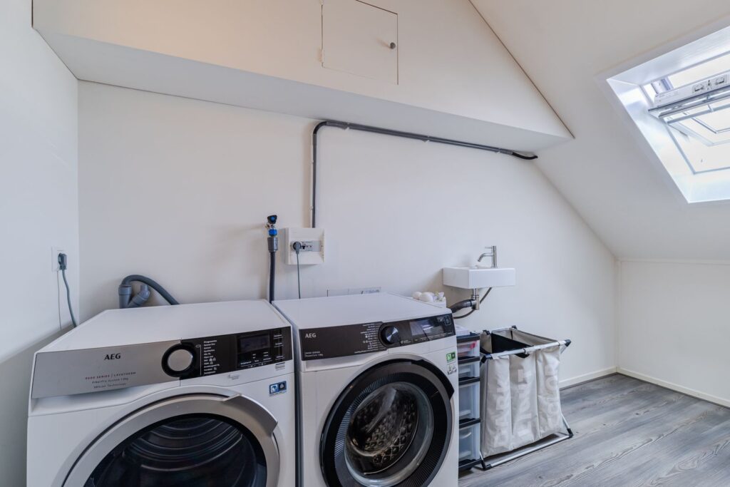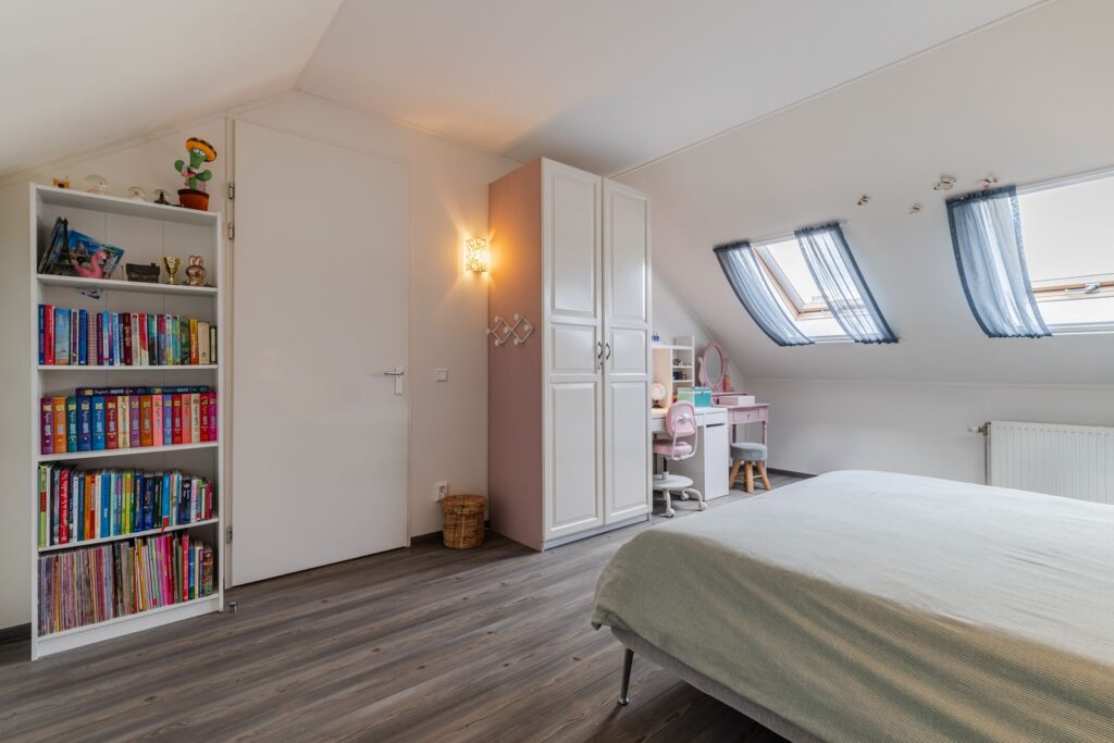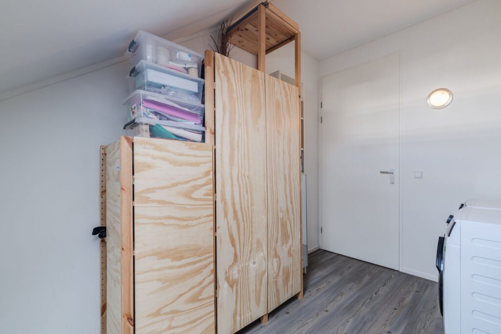 De ruime zolderverdieping is bereikbaar via een vaste trap en biedt een verrassend ruime vierde slaapkamer met twee dakramen en de mogelijkheid voor een werk- of hobbyruimte — perfect voor thuiswerken. In deze slaapkamer zijn over de breedte schotten geplaatst, handig voor het opbergen van seizoensspullen. Daarnaast is er een aparte berging met wasmachine en droger, tevens met een dakraam.