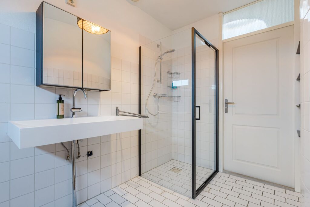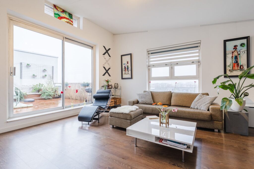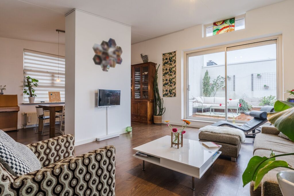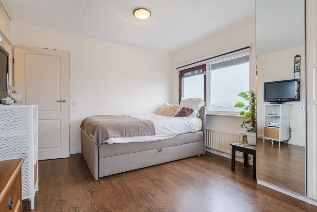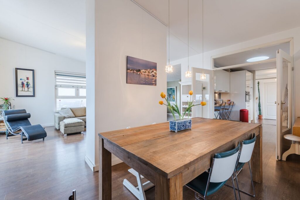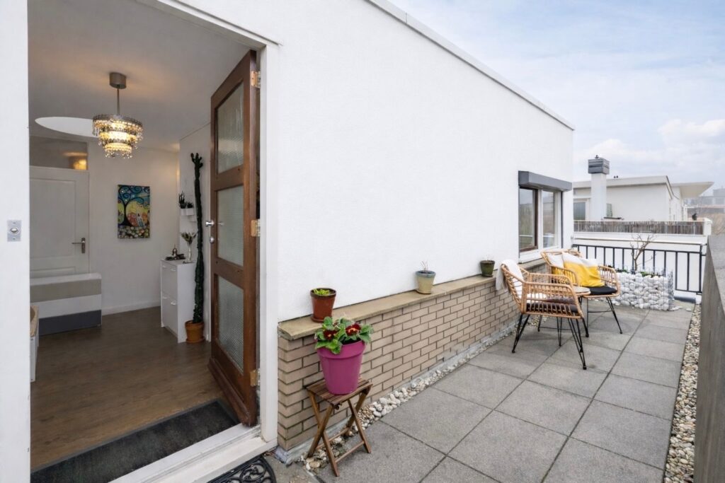 De riante woon- en eetkamer hebben een hoog lessenaarsplafond van maar liefst 3,42 meter(!). Via de schuifpui bereikt u het eveneens riante dakterras op het zuidwesten– een fijne plek om te genieten van lange zomeravonden of even ontspannen weg te dromen.