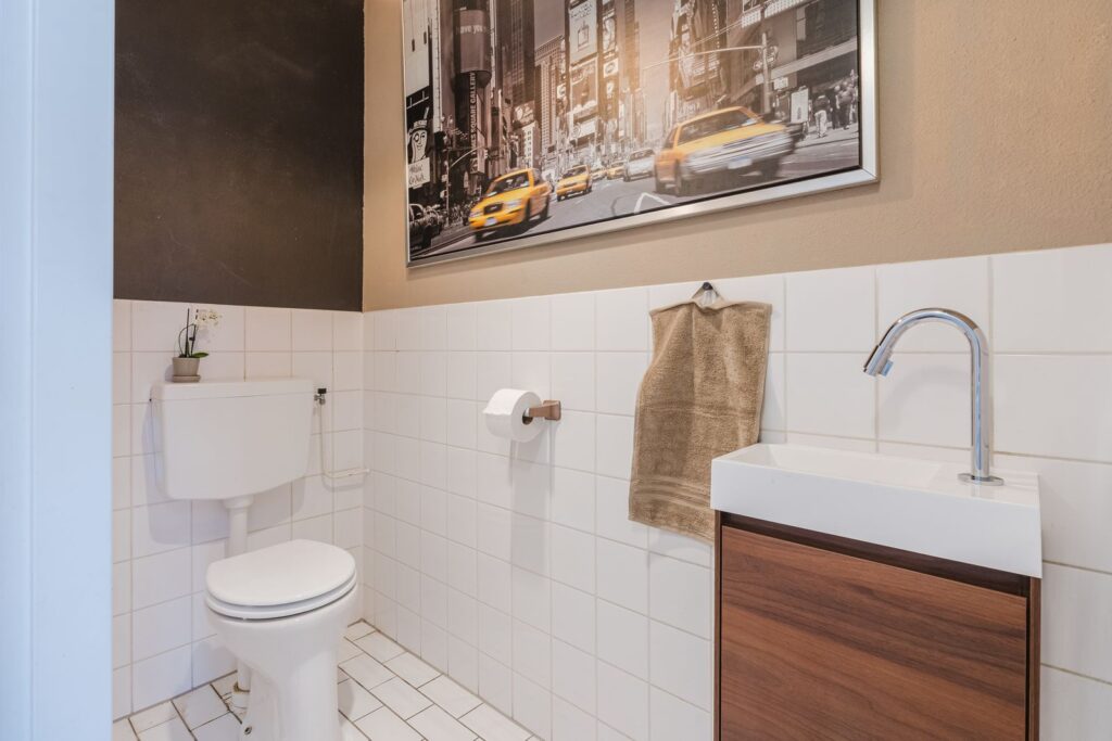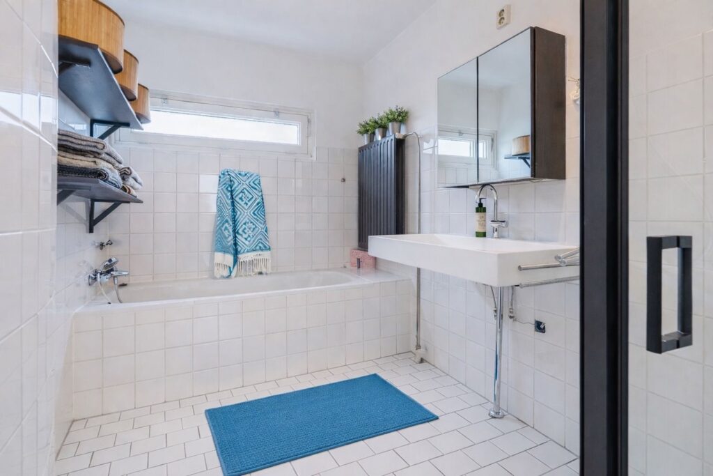 The main bedroom can easily be divided into two bedrooms, as originally designed. Second bedroom located at the front of the property. Spacious bathroom with bathtub, shower, washbasin, and a separate toilet with washbasin.