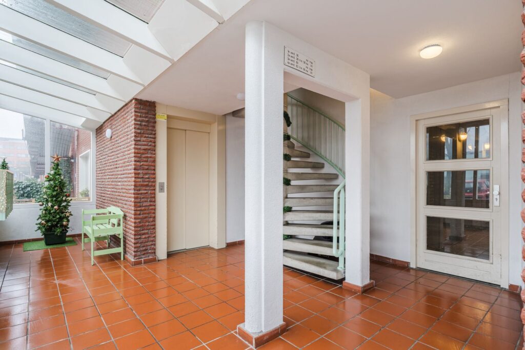 Via lift of trap bereikt u de vierde verdieping met uw eigen opgang naar de woning.