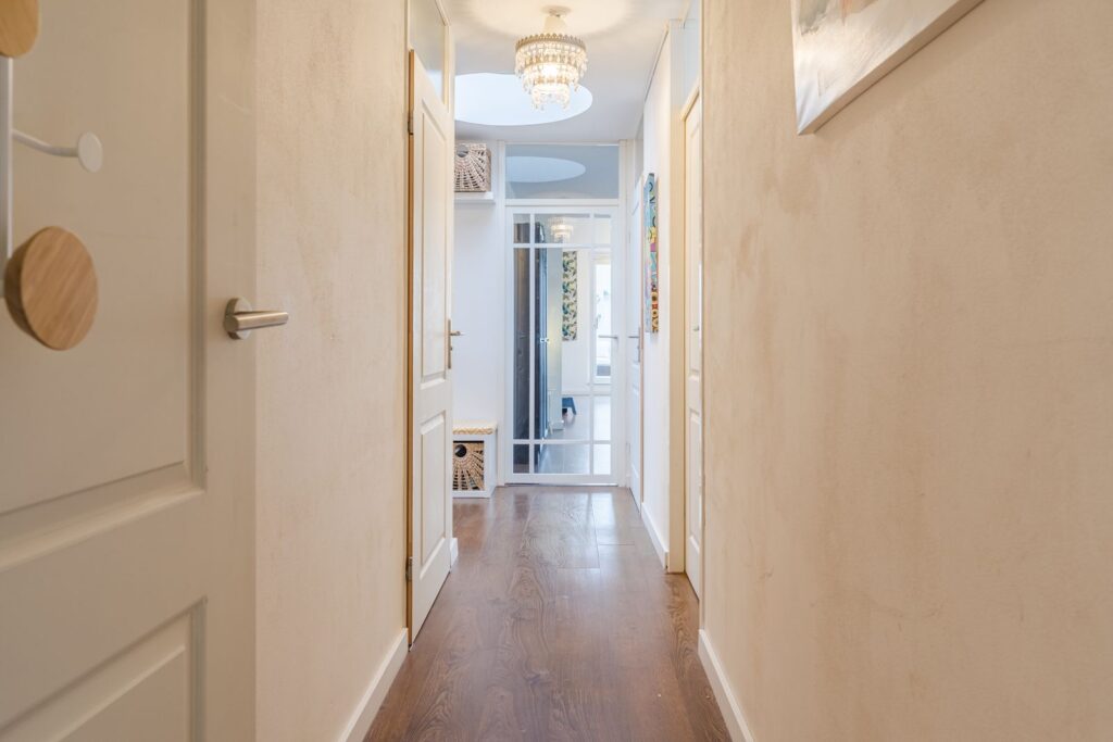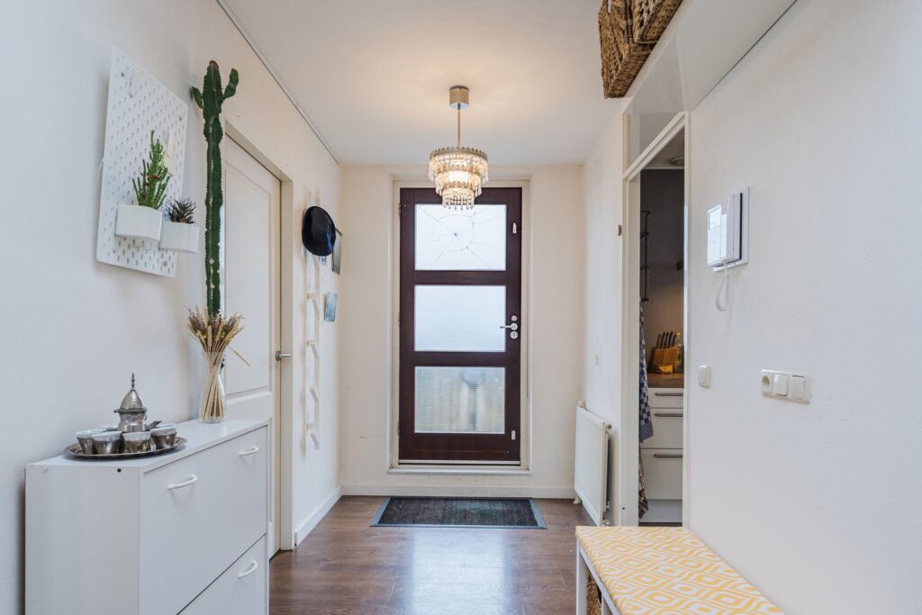 Entree/hal met lichtkoepel. Bijkeuken met aansluiting voor wasmachine, opstelling van de cv-ketel en een modern, vrijwel geruisloos ventilatiesysteem (2024).