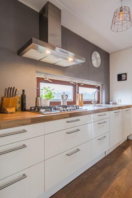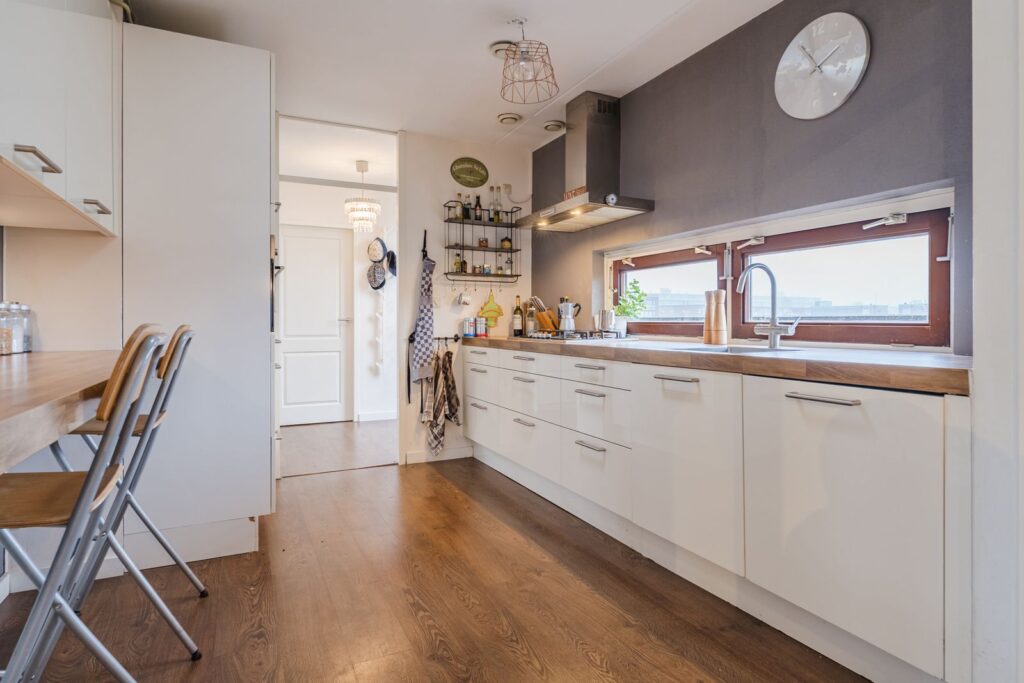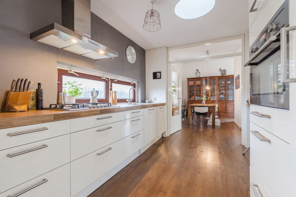 De doorlopende laminaatvloer zorgt voor een rustige en ruimtelijke uitstraling in de gehele woning.