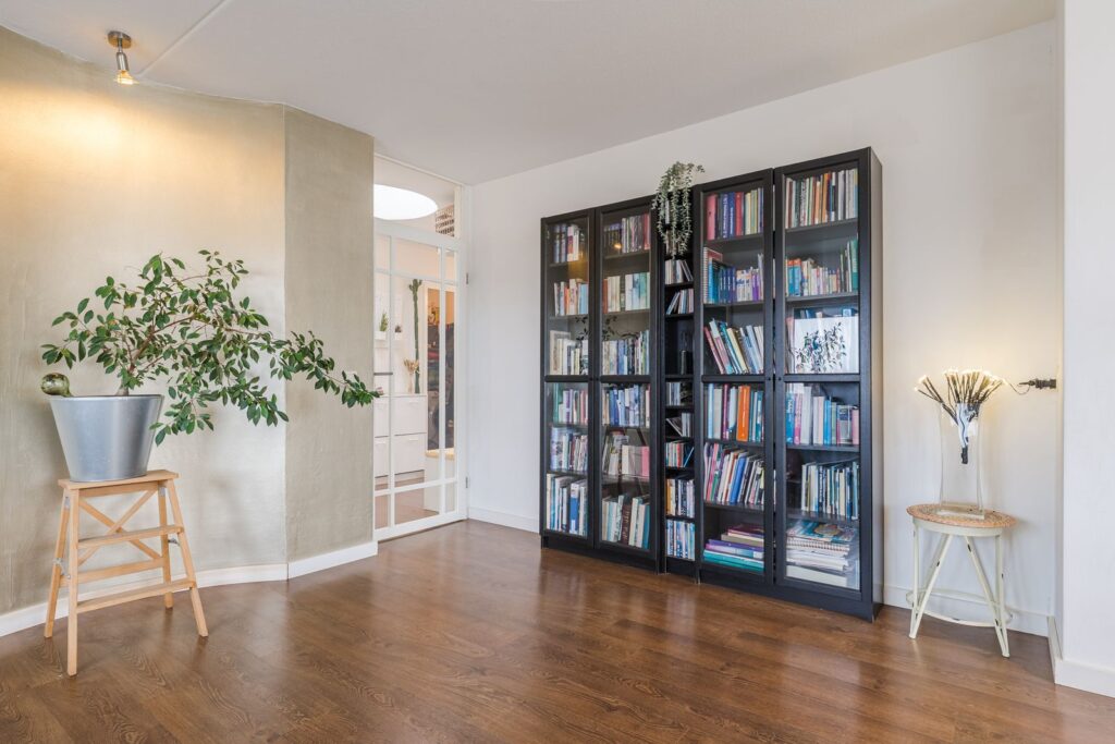 The continuous laminate flooring throughout the apartment creates a calm and spacious feel.