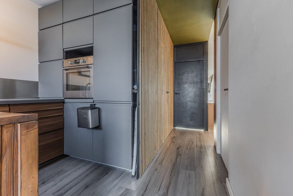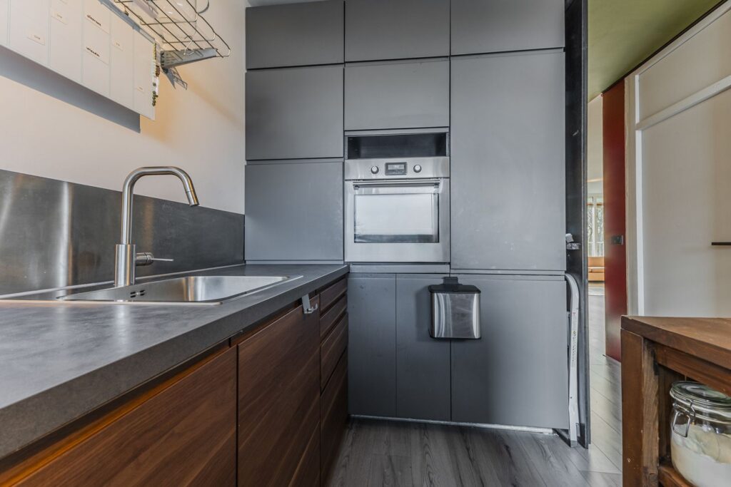 Entree met meterkast en intercom, die overloopt in de ruime keuken (2023). De keuken is voorzien van een inductiekookplaat met geïntegreerde afzuigkap, vaatwasser, spoelbak met flexibele kraanslang, oven en koel-/vriescombinatie.