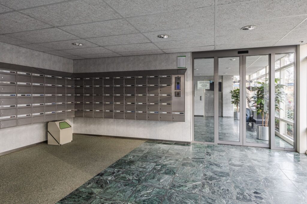 Verzorgde centrale entree met bellentableau, brievenbussen, liften, trappenhuis, bergingen en containerruimte.