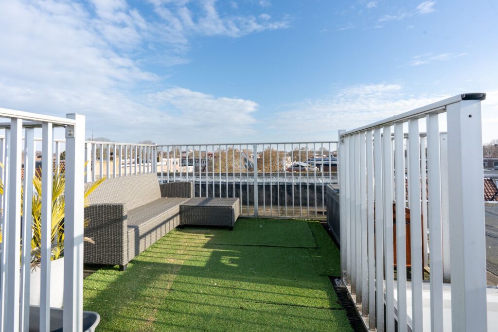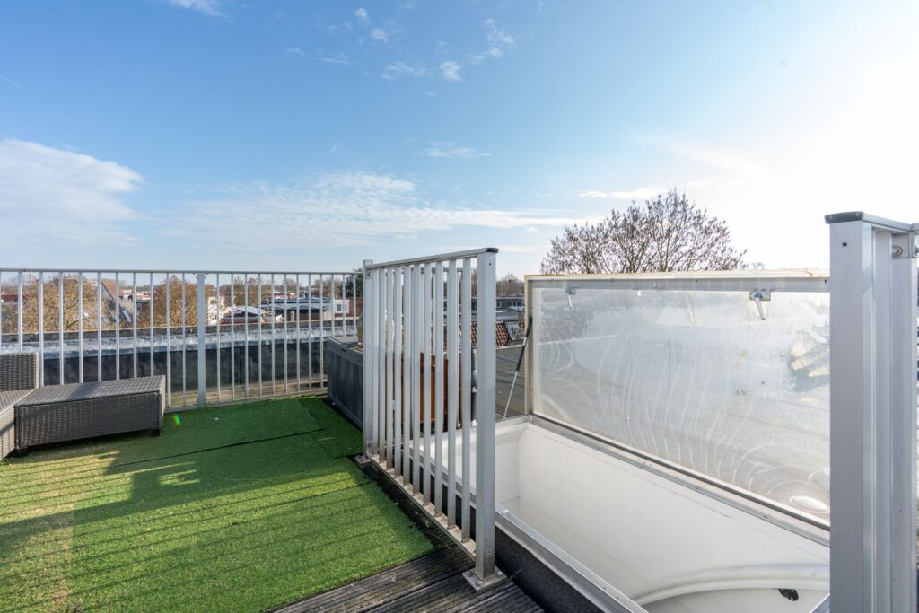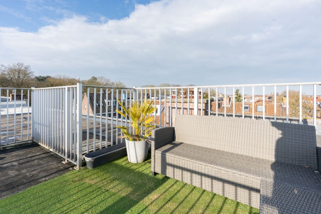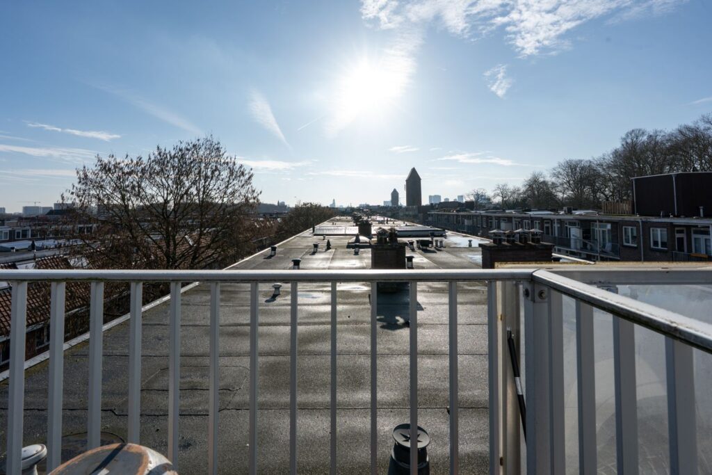 Via het trappenhuis bereik je het heerlijke gedeelde dakterras. Hier kun je genieten van de zon en het vrije uitzicht over de stad. Een fijne plek om te ontspannen, te borrelen met vrienden of gewoon even buiten te zitten.