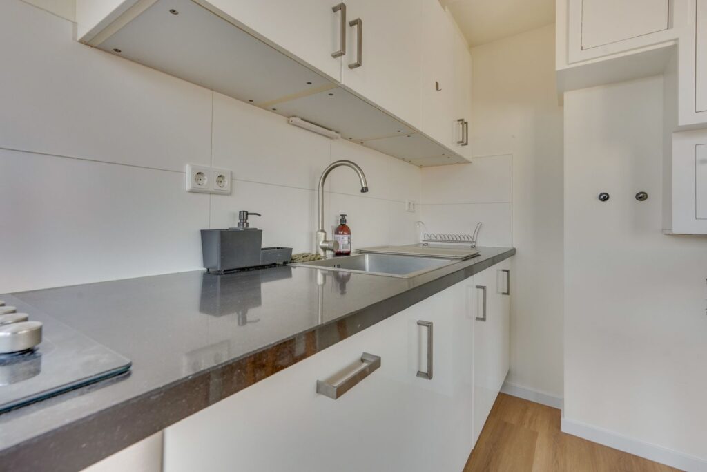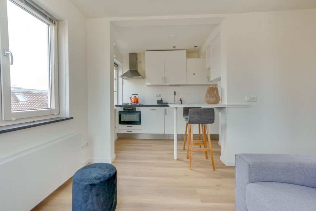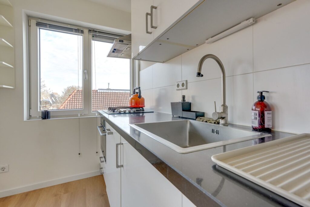 De woonkamer ligt aan de voorzijde van de woning en is dankzij de grote raampartijen heerlijk licht. Er is voldoende ruimte voor een gezellige zithoek en een eettafel. De open keuken staat in verbinding met de woonkamer en is uitgevoerd in een lichte kleurstelling met een donker werkblad. De keuken is voorzien van een gaskookplaat, afzuigkap, vaatwasser oven en afzuigkap.